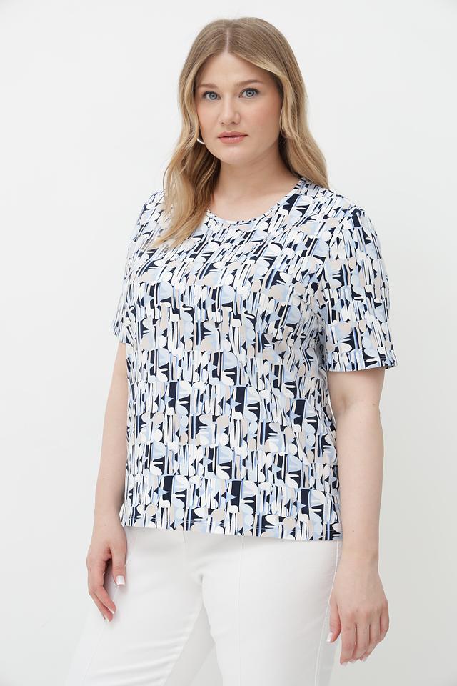 Футболка имеет прямой крой и короткие рукава, что делает ее идеальной для повседневной носки. Главной особенностью модели является яркий и необычный геометрический принт, выполненный в голубых и белых тонах. Этот принт добавит вашему образу оригинальности и индивидуальности.
