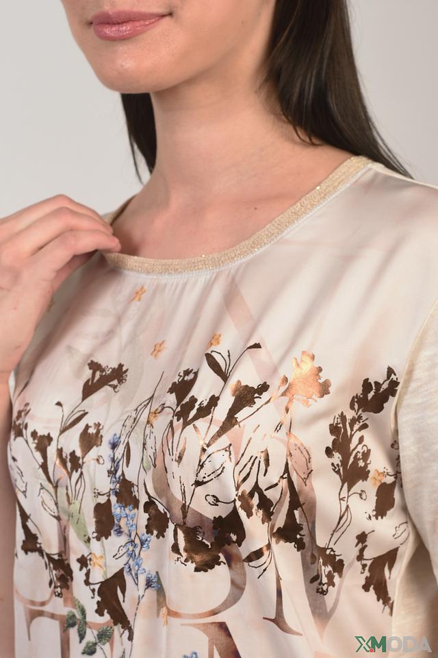 Женская футболка Lecomte бежевого цвета с цветочным принтом и короткими рукавами. Изготовлена из мягкого хлопка с модалом для комфорта и приятных ощущений. Отличный выбор для создания повседневного образа. Состав: хлопок 50%, модал 50%