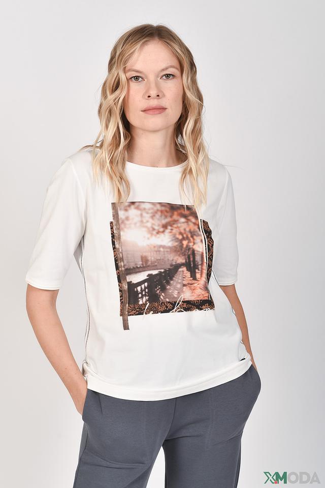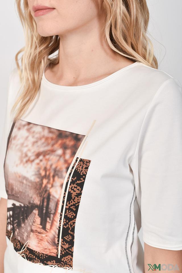 Эта футболка от Lecomte станет отличным дополнением к вашему гардеробу. Она выполнена в белом цвете и украшена ярким принтом с изображением пейзажа, выполненным в коричнево-золотистых тонах.