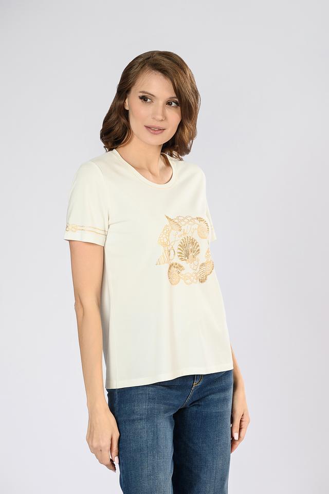 Модель имеет классический крой с короткими рукавами и круглым вырезом горловины. Рукава отделаны тонкой золотистой тесьмой, что добавляет образу изысканности. Футболка выполнена из приятной к телу ткани, сочетающей в себе 63% вискозы и 37% полиамида, что обеспечивает комфорт при носке и хорошую посадку по фигуре.