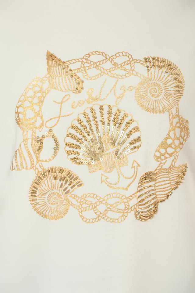Эта футболка от Leo & Ugo станет прекрасным дополнением к вашему гардеробу. Она выполнена в нежном бежевом цвете и украшена изысканной вышивкой, изображающей морские раковины и элементы декора в золотистом цвете.
