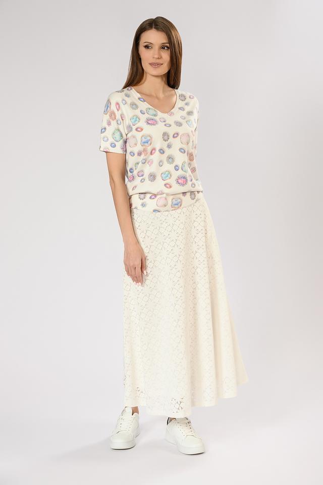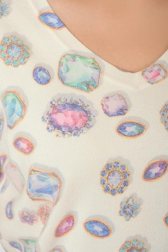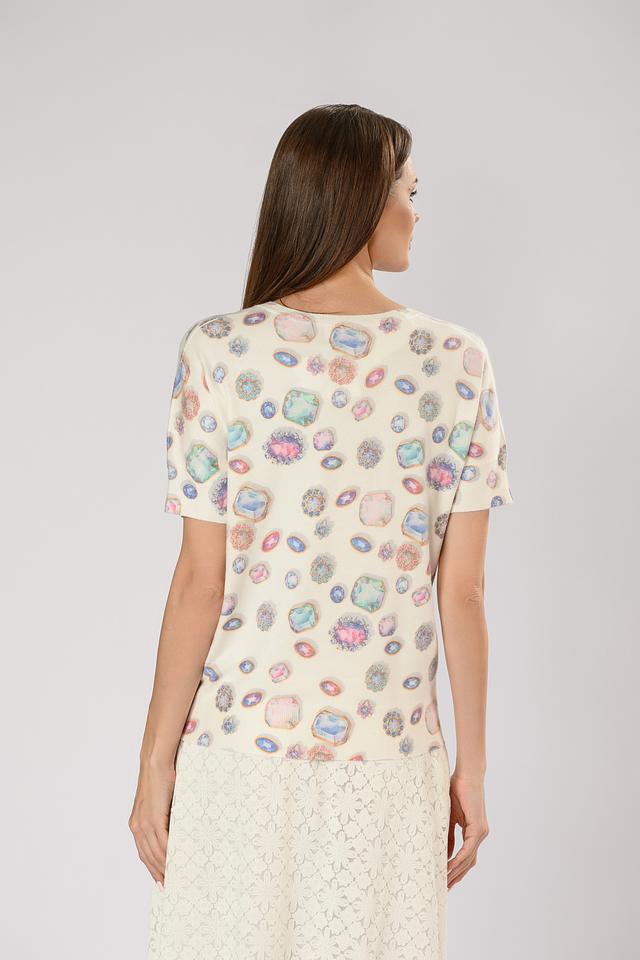 Женская футболка Leo & Ugo кремового цвета с оригинальным принтом в виде драгоценных камней. Модель с короткими рукавами и V-образным вырезом станет ярким акцентом в вашем образе. Состав: вискоза 40%, нейлон 36%, полиэстер 24%
