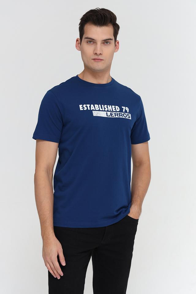 На передней части футболки расположен белый принт с надписью "ESTABLISHED 79" и логотипом бренда Lerros. Круглый вырез горловины и короткие рукава обеспечивают свободу движений. На левой стороне груди, сбоку, присутствует небольшой логотип бренда.
