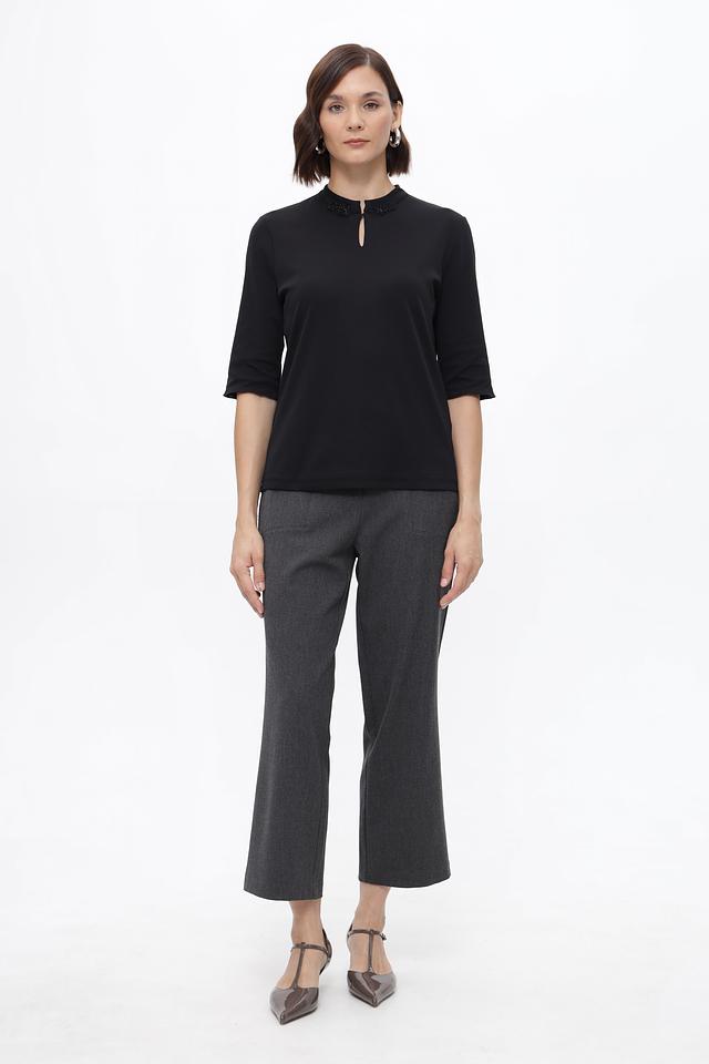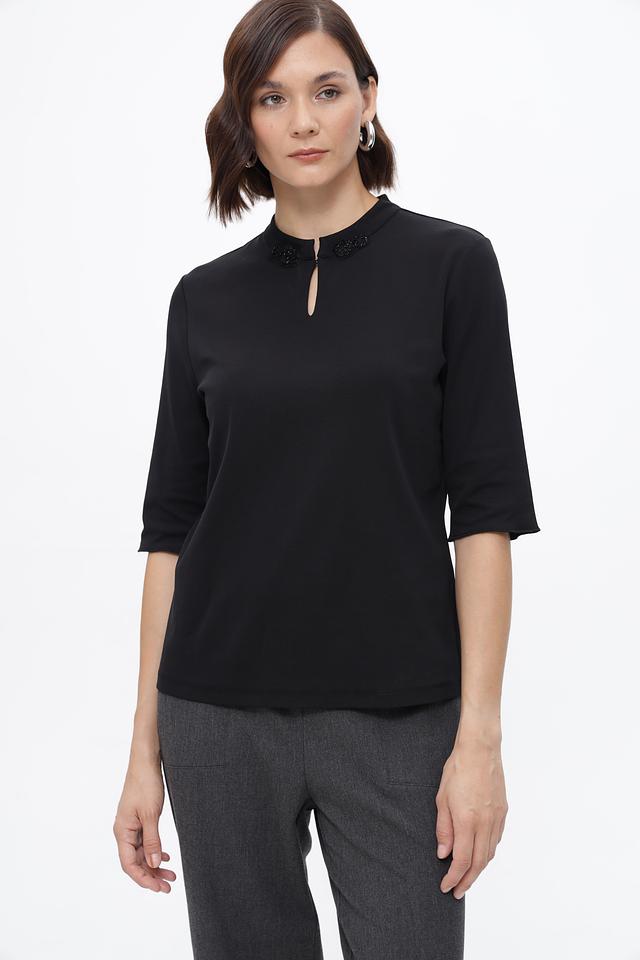 Особенностью данной модели является декоративный вырез на горловине, украшенный небольшими элементами. Вырез придает образу изысканность и оригинальность. Блуза имеет укороченный рукав, что делает ее подходящей для теплой погоды.
