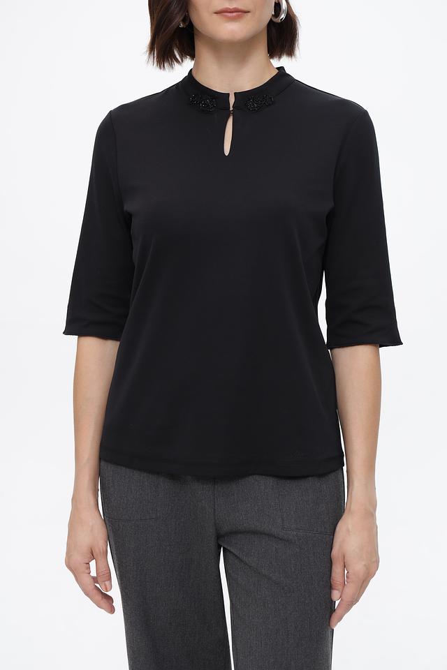 Чёрная блуза Marc Cain с декоративным вырезом на горловине. Изготовлена из мягкого хлопка с добавлением эластана для комфорта и хорошей посадки. Идеально подходит для создания элегантного образа. Состав: хлопок 95%, эластан 5%