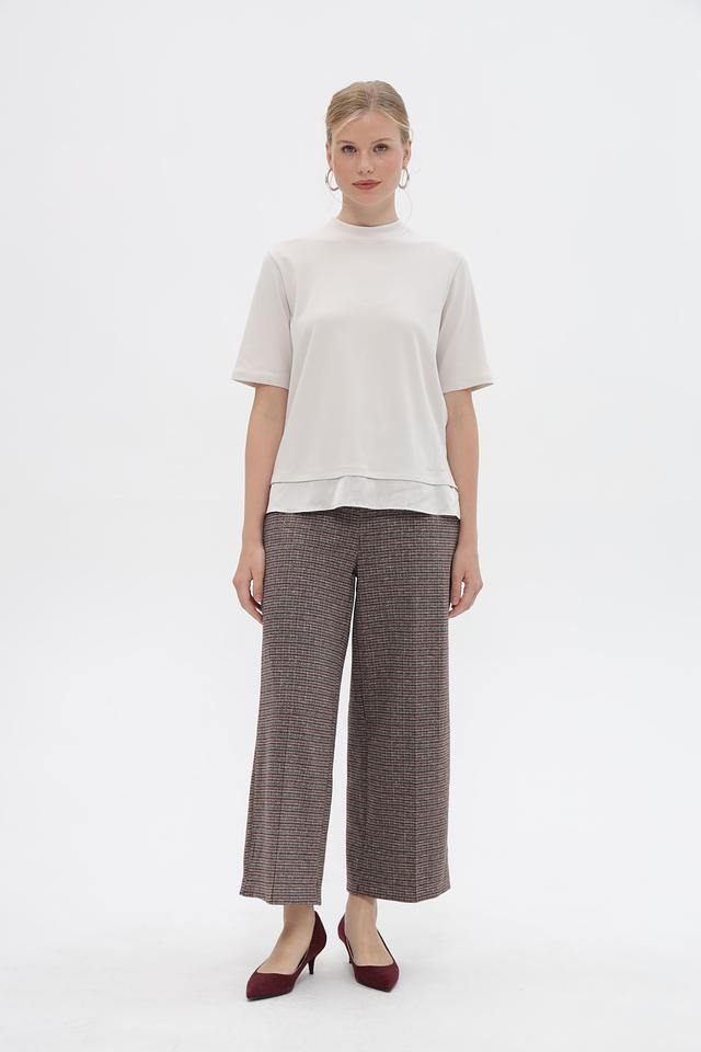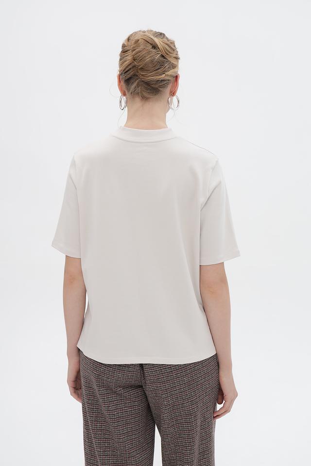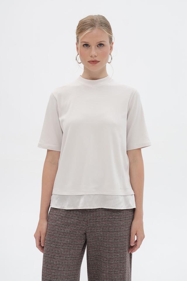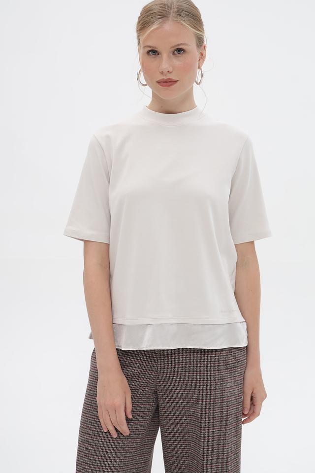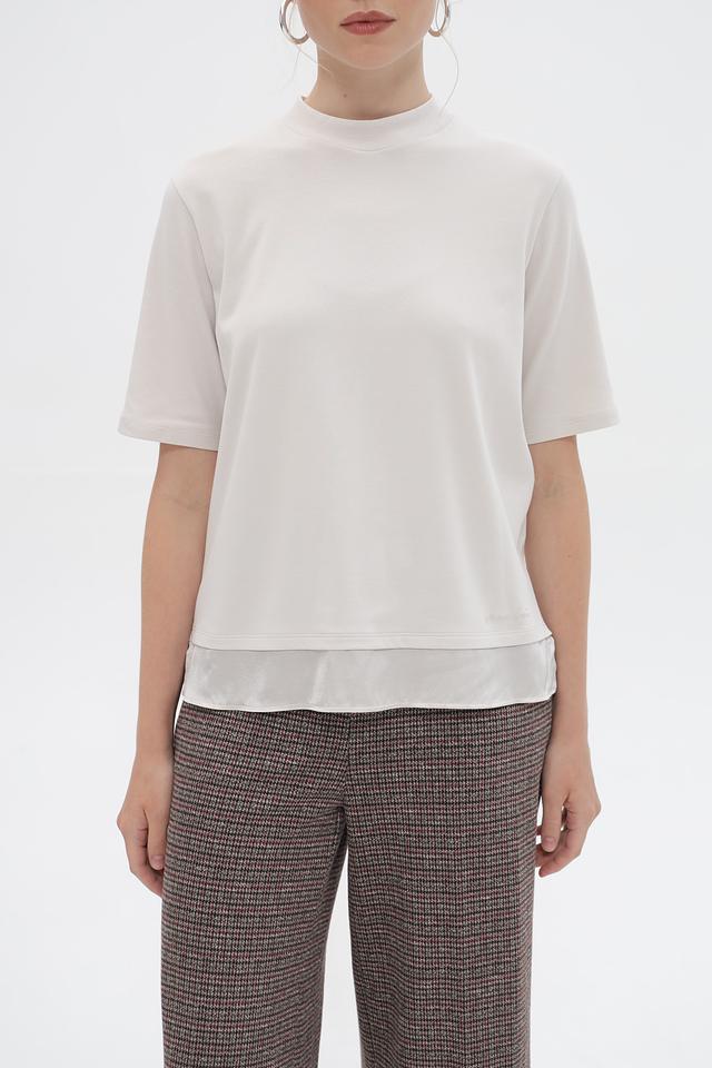 Особенностью данной футболки является контрастная белая подкладка, которая создает интересный эффект многослойности и добавляет образу изюминку. Короткие рукава и круглый вырез делают эту футболку универсальной для различных образов.