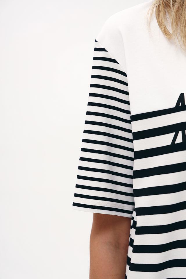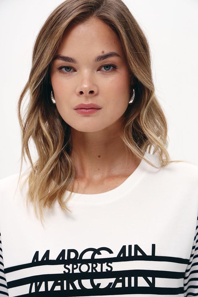 Женская футболка Marc Cain Sports чёрно-белого цвета с логотипом и полосками. Изготовлена из хлопка с добавлением эластана для комфорта и лучшей посадки. Состав: хлопок 95%, эластан 5%