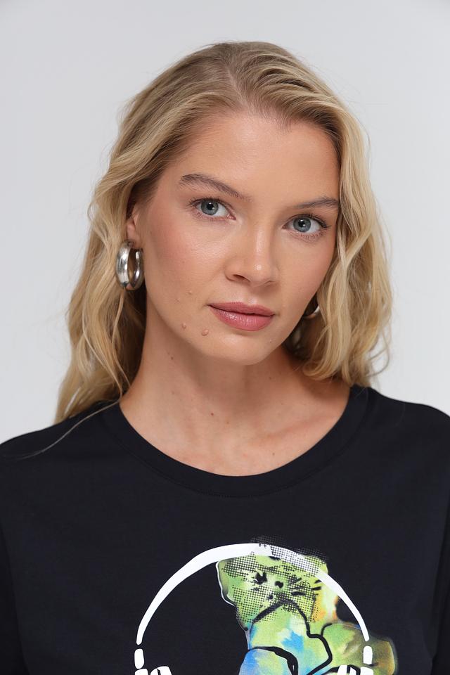 Чёрная футболка Marc Cain из 100% хлопка с ярким принтом в виде наушников и абстрактного рисунка. Комфортный крой и натуральный материал обеспечивают удобство в повседневной носке. Состав: хлопок 100%