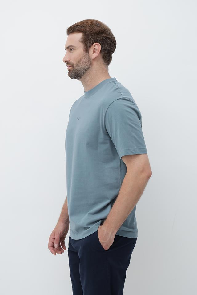 На груди футболки расположен небольшой логотип бренда, выполненный в тон ткани. Это придает ей лаконичный и стильный вид. Цвет футболки – приглушенный голубой, который легко сочетается с другими элементами одежды.