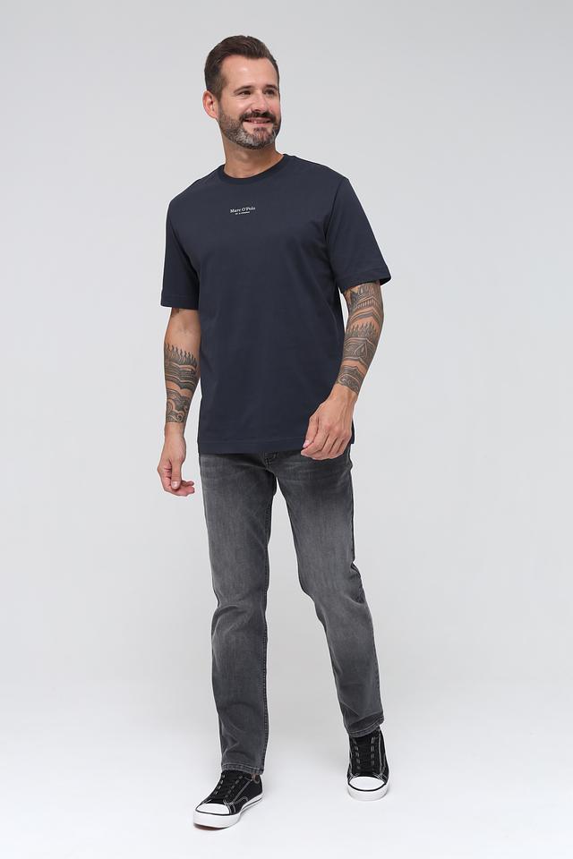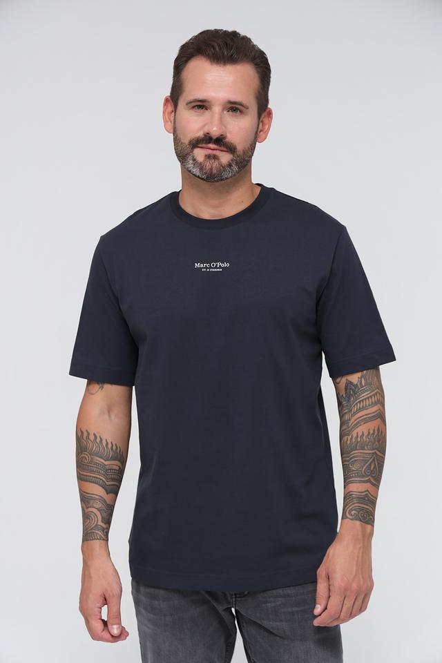 Футболка имеет прямой силуэт и короткие рукава. На груди расположен небольшой логотип бренда, выполненный в тон ткани, что придает модели лаконичный и стильный вид. Цвет футболки – насыщенный темно-синий, который легко сочетается с различными элементами гардероба.