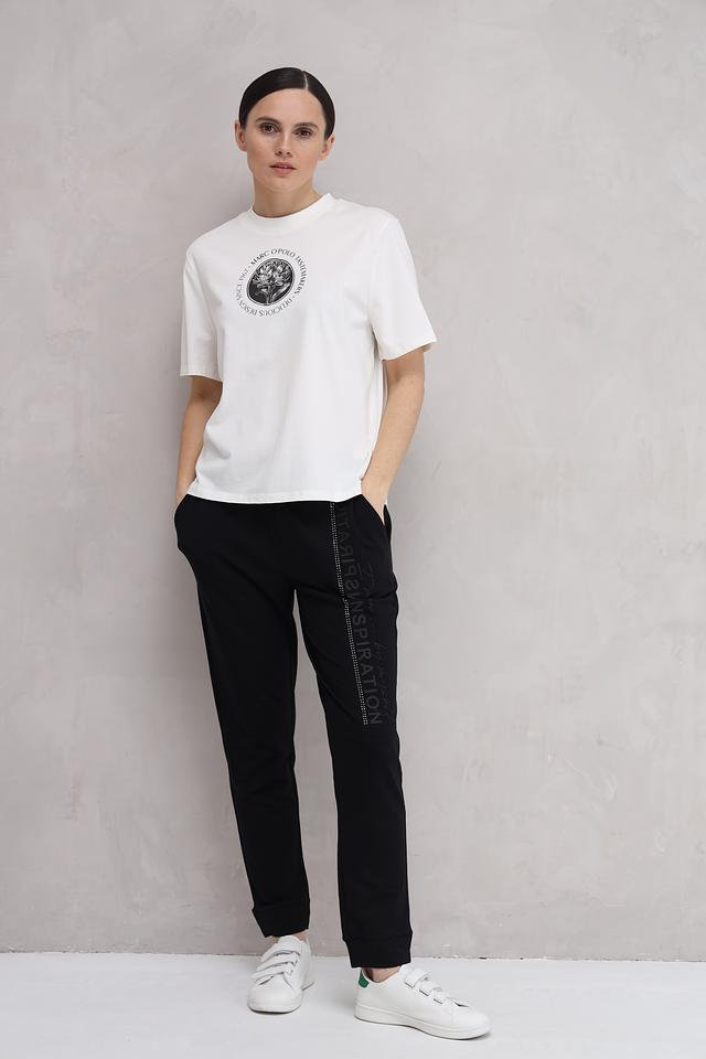 Футболка имеет классический прямой крой, который подходит для любой фигуры. На груди расположен круглый логотип бренда, выполненный в чёрном цвете, что придает ей узнаваемый и стильный вид.