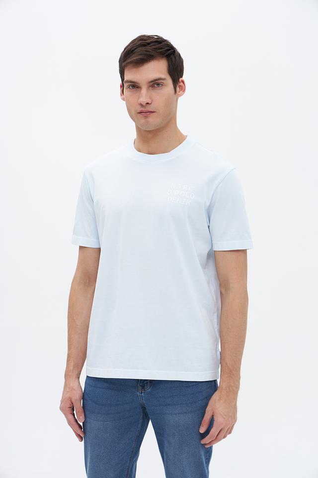 Дизайн футболки отличается лаконичностью и минимализмом. На груди и спине нанесена надпись "MARC O'POLO DENIM", выполненная в тон ткани, что придает ей особый шарм. Круглый вырез горловины и короткие рукава делают эту футболку идеальным выбором для теплой погоды.