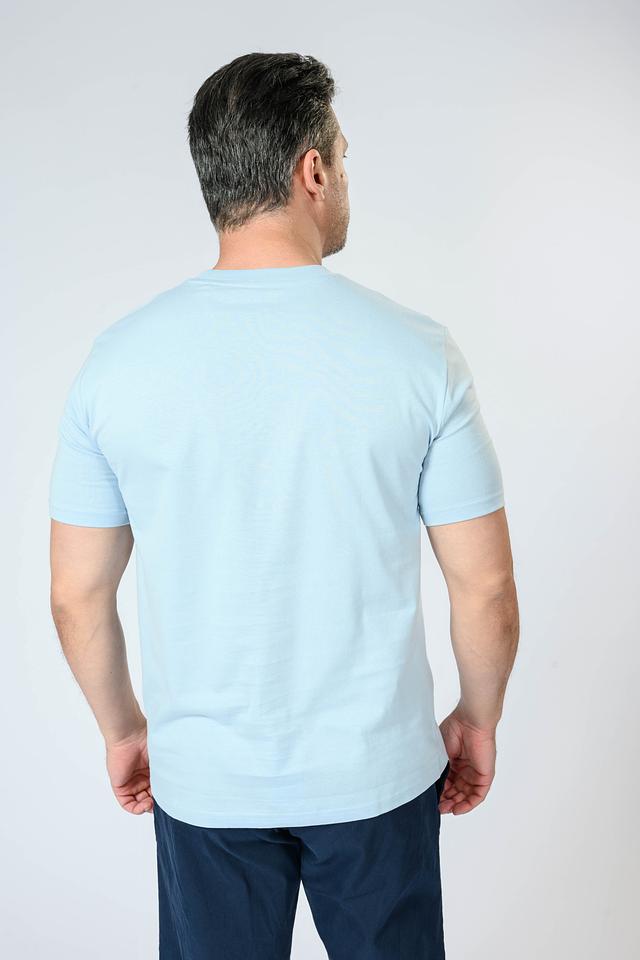 Модель имеет классический прямой крой, который подходит для любого типа фигуры. Футболка выполнена в нежном голубом цвете, который легко сочетается с различными элементами гардероба.