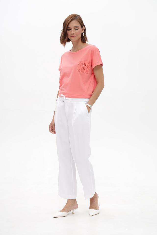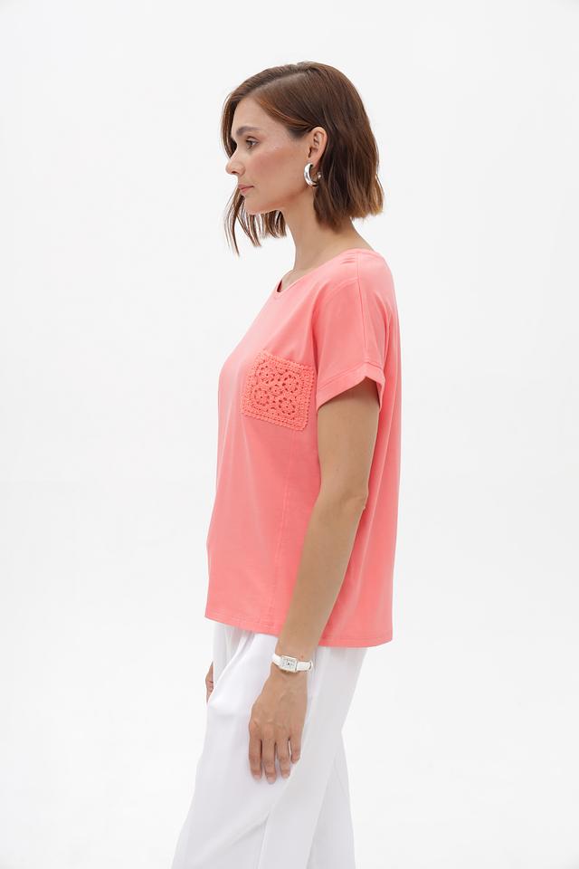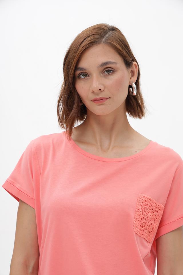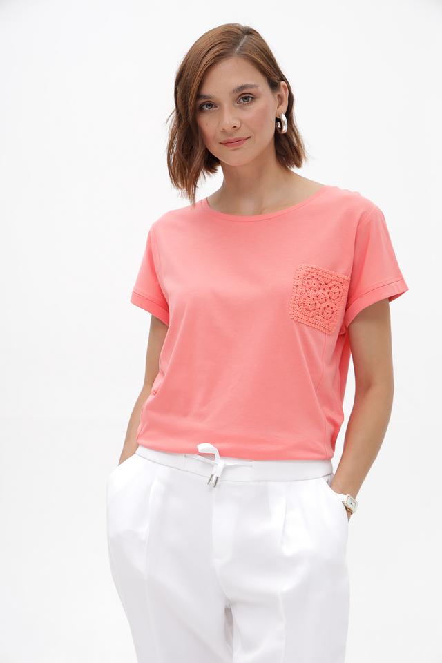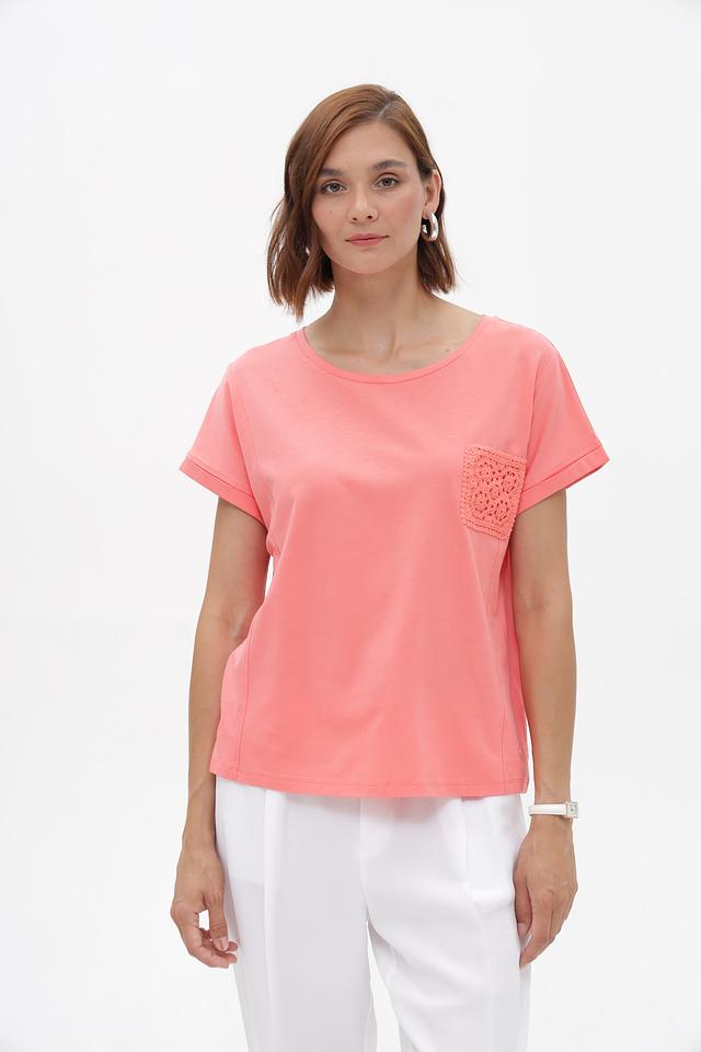 Женская футболка Monari нежного персикового цвета, украшенная декоративным карманом из кружева. Изготовлена из мягкого хлопка с модалом для комфорта и приятных ощущений. Идеальный выбор для создания стильного повседневного образа. Состав: хлопок 50%, модал 50%