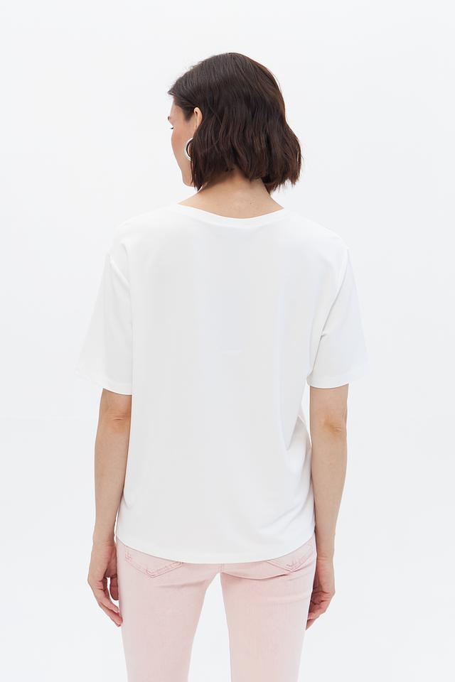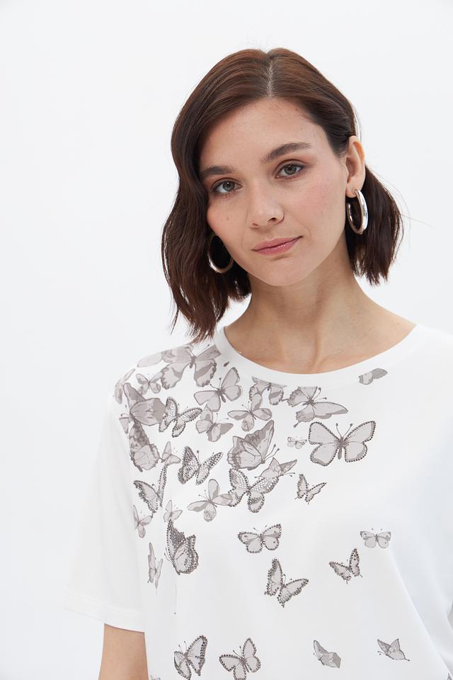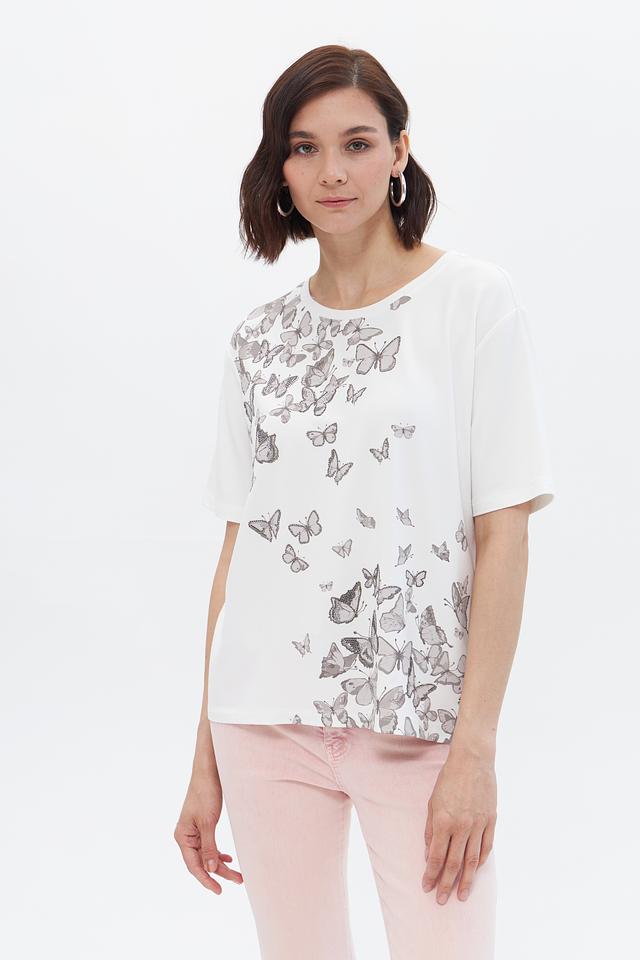 Эта стильная футболка от Monari выполнена в белом цвете и украшена изысканным принтом с изображением бабочек. Футболка имеет прямой крой и короткие рукава, что делает ее идеальным выбором для теплой погоды.