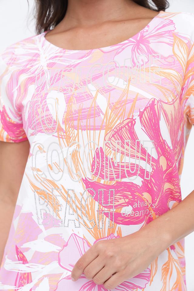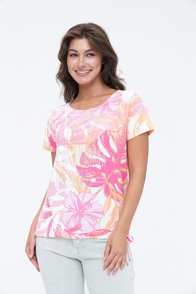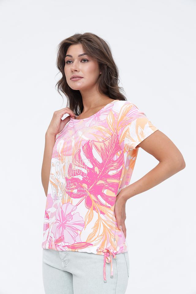 Женская футболка Monari нежно-розового цвета с ярким тропическим принтом станет отличным дополнением к летнему гардеробу. Модель выполнена из мягкой и приятной к телу ткани, обеспечивающей комфорт в жаркую погоду. Состав: вискоза 45%, модал 45%, эластан 10%
