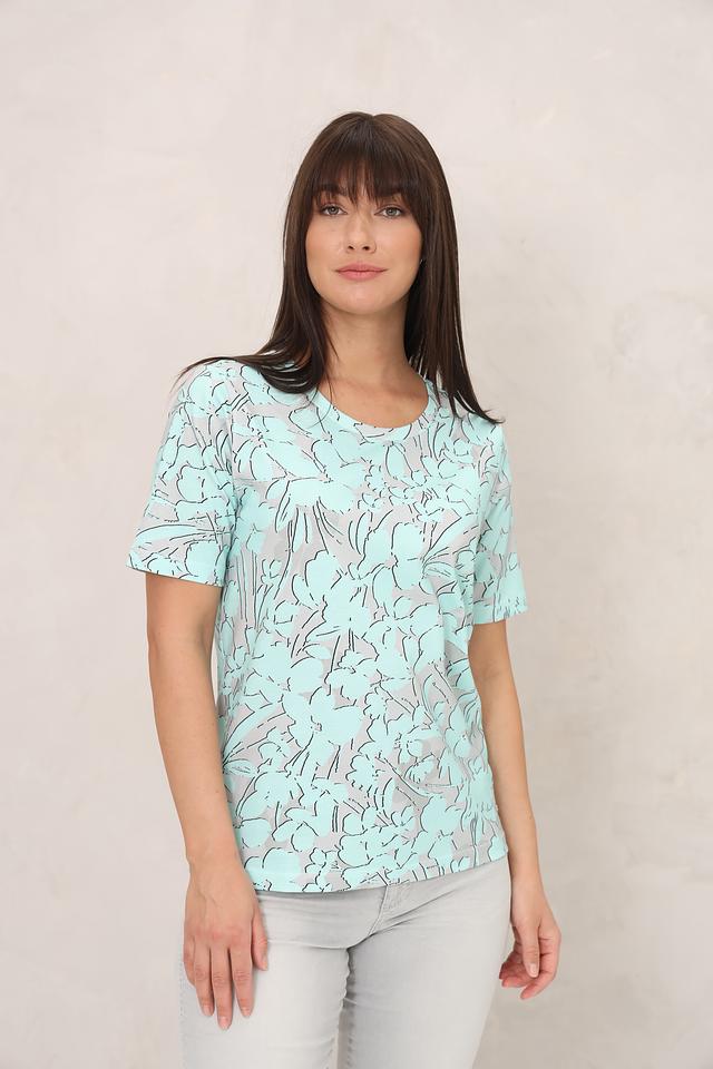 Особенностью данной модели является оригинальный принт в светло-серых и бежевых тонах на мятном фоне. Футболка имеет прямой крой и короткие рукава, что делает ее универсальной для различных типов фигур.