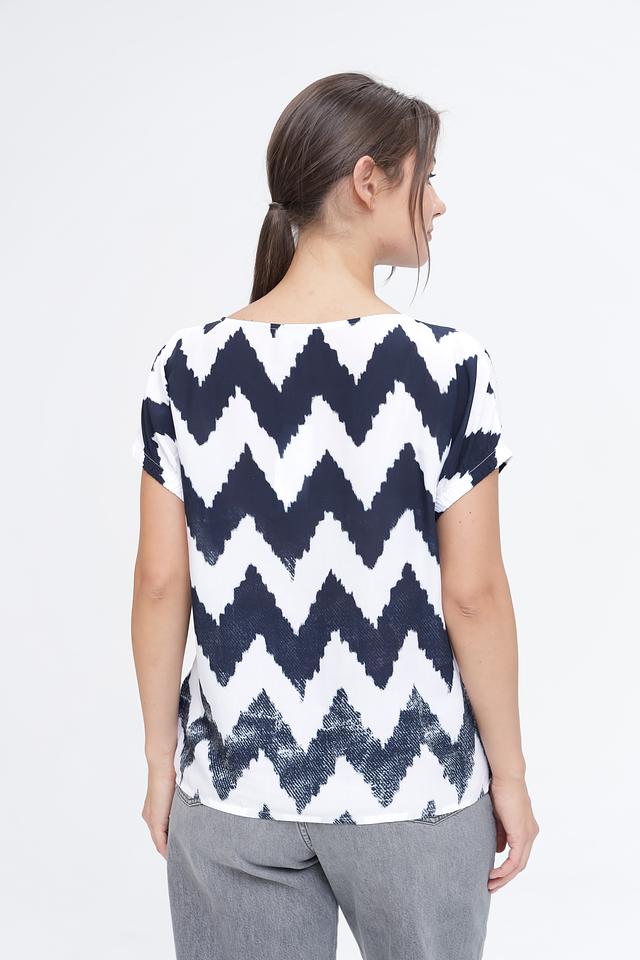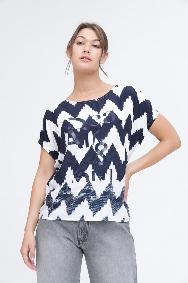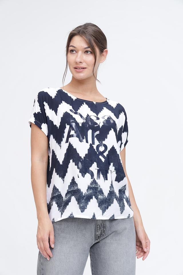 Женская футболка Monari белого и синего цвета с оригинальным зигзагообразным принтом и надписью. Изготовлена из мягкой и приятной к телу вискозы, обеспечивающей комфорт в носке. Состав: вискоза 100%