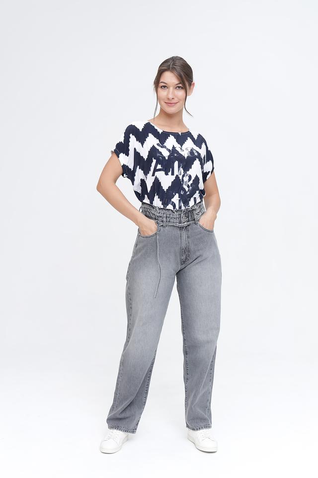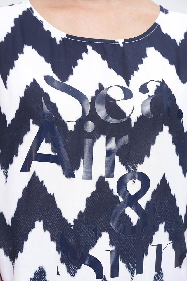 Футболка имеет свободный крой и короткие рукава, что обеспечивает свободу движений. Особенностью модели является яркий зигзагообразный принт в сочетании синего и белого цветов, а также стильная надпись, добавляющая образу оригинальности.