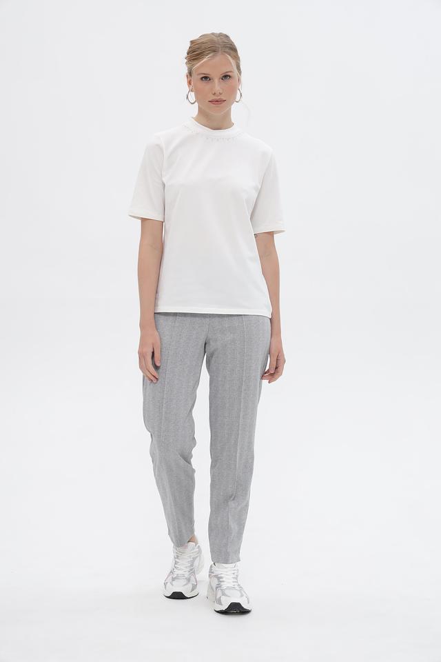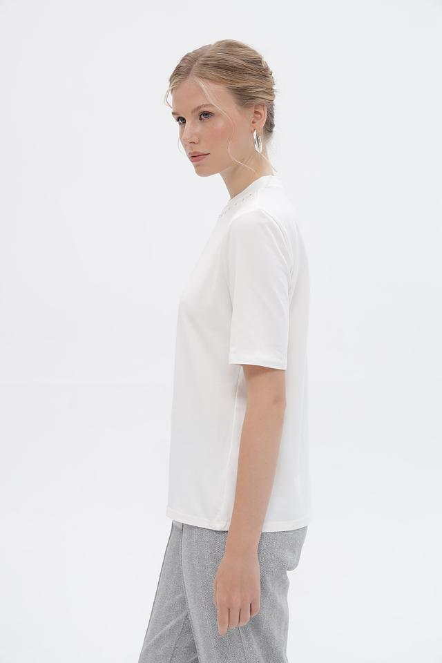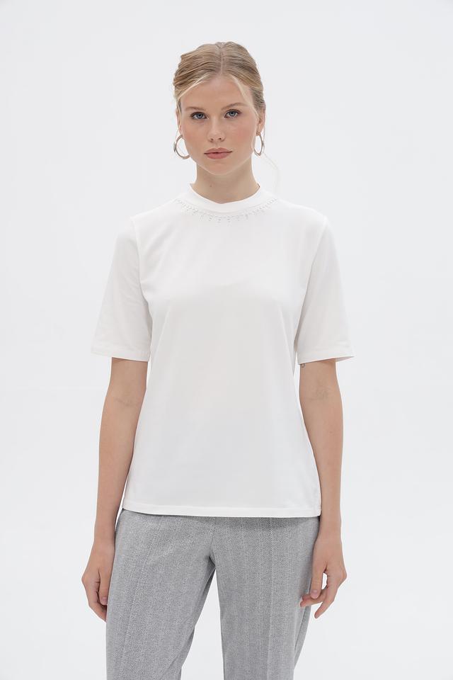 Особенностью данной футболки является декор из небольших бусин, расположенный вокруг горловины, который придает образу изысканность.