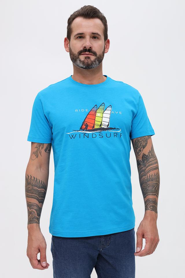 Бирюзовая футболка Granchio с ярким принтом в виде виндсерфера. Изготовлена из 100% хлопка, обеспечивающего комфорт и воздухопроницаемость. Отличный выбор для активного отдыха и повседневной носки. Состав: хлопок 100%