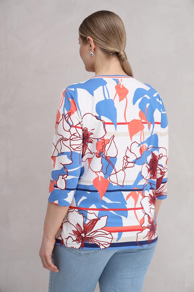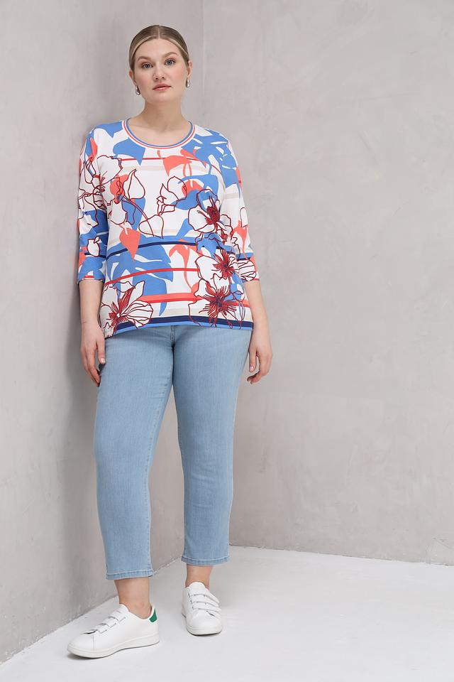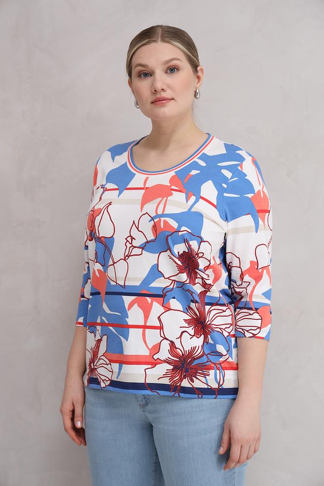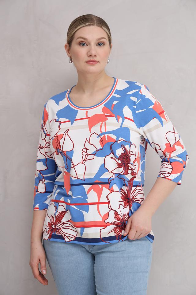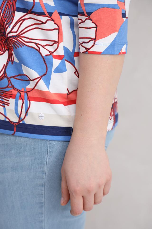 Женская футболка Olsen голубого цвета с ярким цветочным принтом и рукавом 3/4. Изготовлена из мягкого хлопка с добавлением эластана для комфорта и свободы движений. Состав: хлопок 95%, эластан 5%