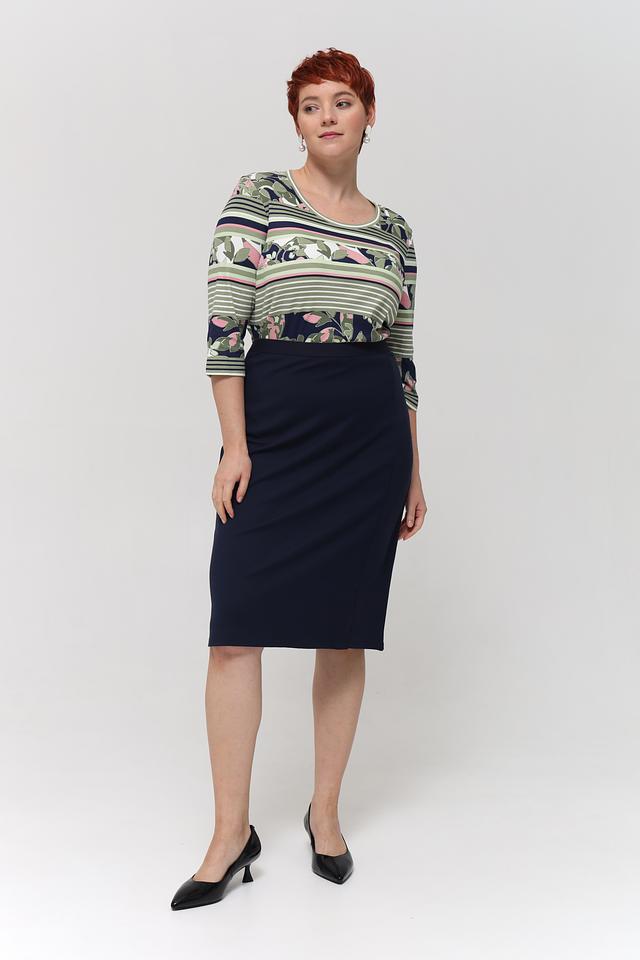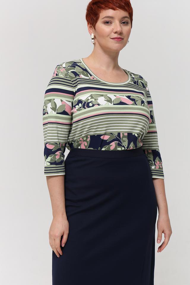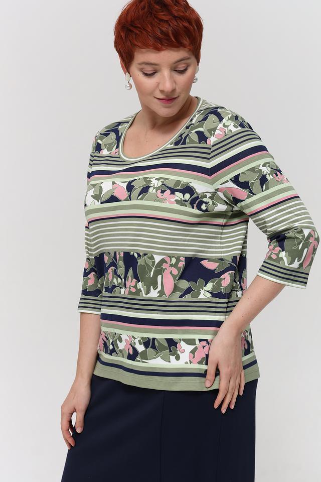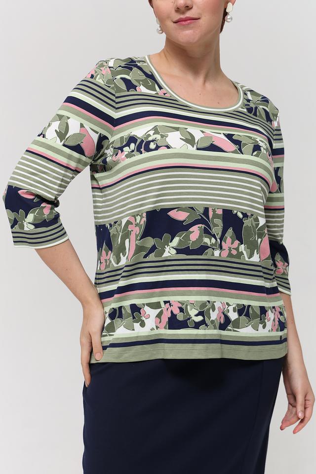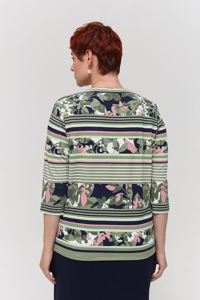 Футболка имеет прямой крой и длину до бедра. Рукав – три четверти. Основной цвет – зеленый, украшен ярким цветочным принтом в оттенках розового, синего и белого. Принт расположен по всей поверхности изделия, создавая эффектный и запоминающийся образ.