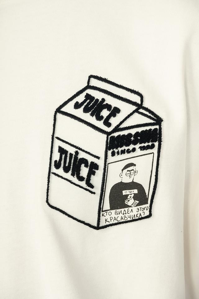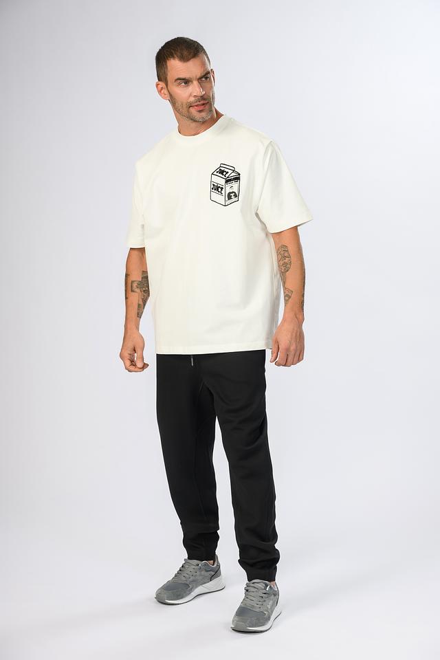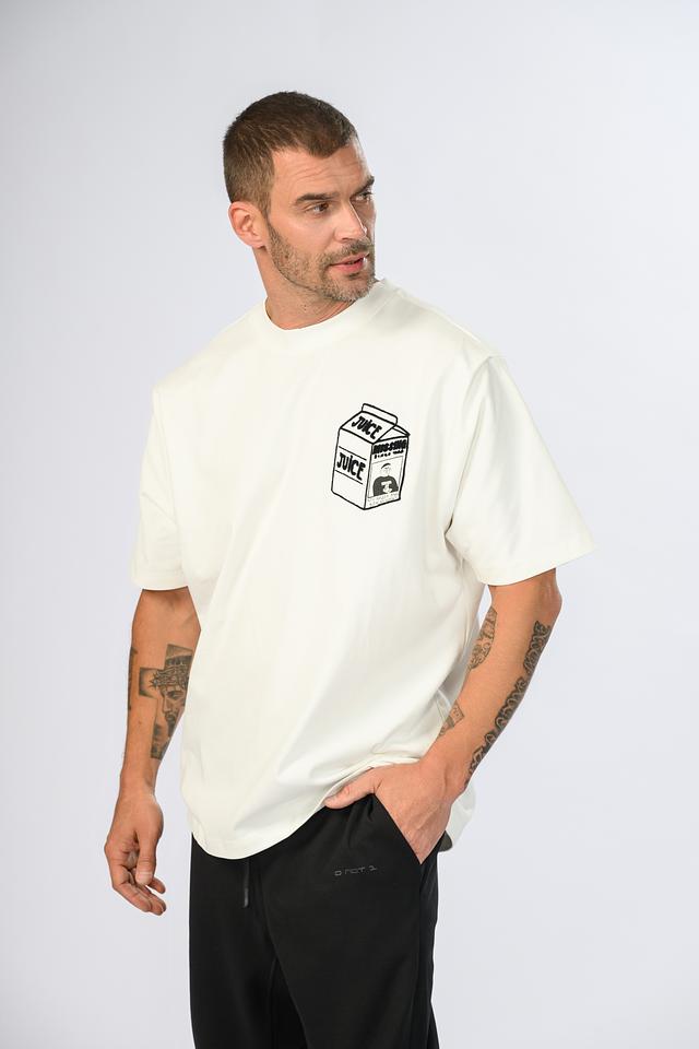 Мужская футболка Onot1 молочного цвета с оригинальным принтом в виде упаковки сока. Изготовлена из 100% хлопка, обеспечивающего комфорт в носке. Отличный выбор для создания повседневного образа. Состав: хлопок 100%