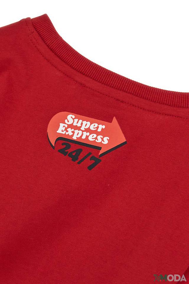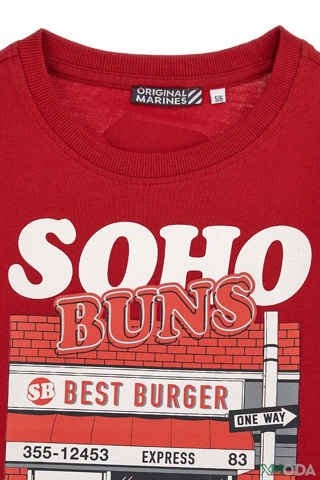 Основной цвет футболки – насыщенный красный, который привлекает внимание и создает позитивное настроение. На передней части футболки расположен крупный, детализированный принт в стиле ретро, изображающий фасад бургерной "Soho Buns".