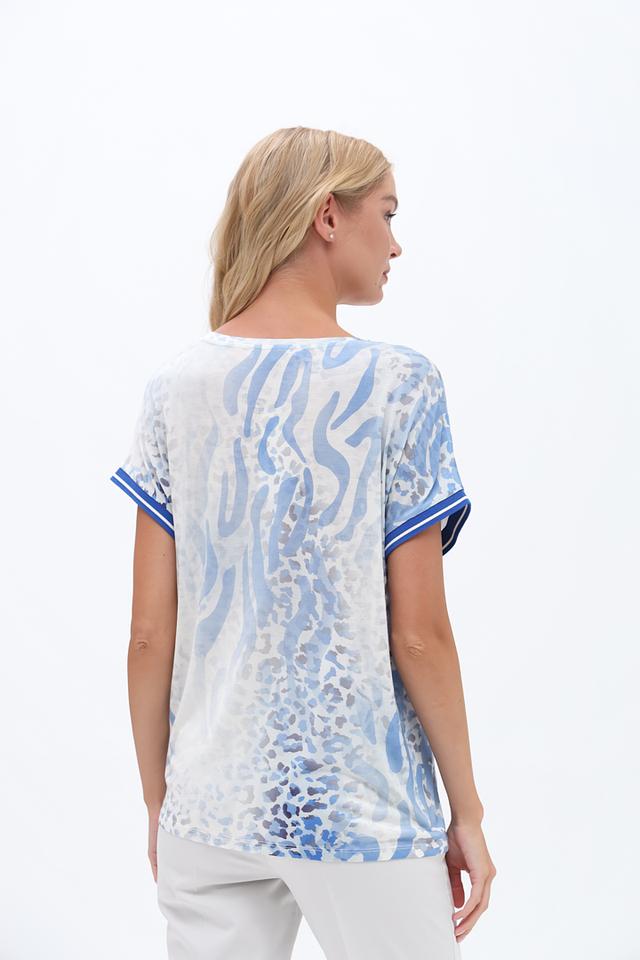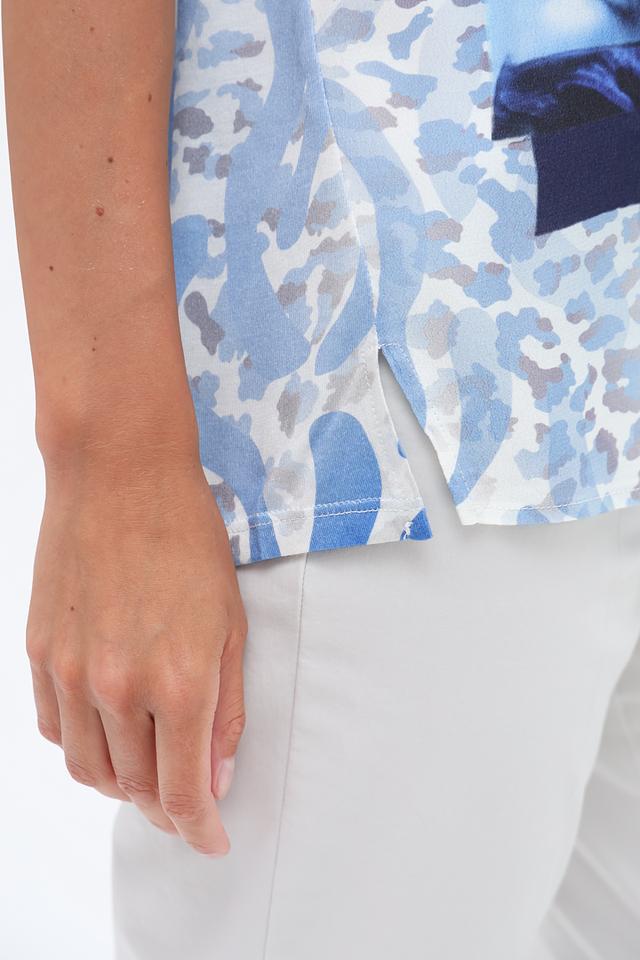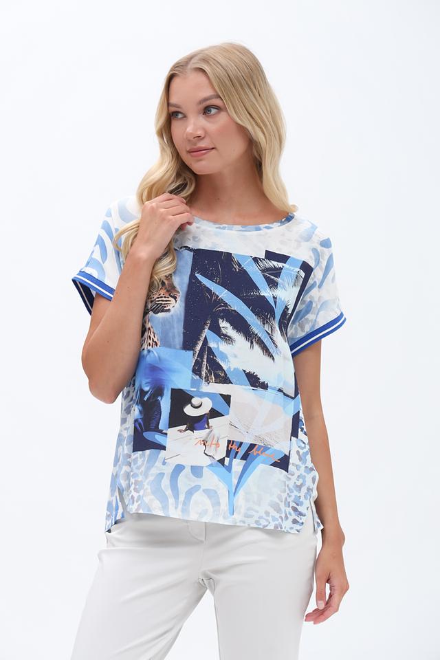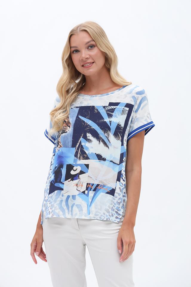 Основной цвет футболки – голубой, но она украшена ярким и красочным принтом с изображением тропических пальм, экзотических птиц и абстрактных узоров. Принт выполнен в сочетании синих, белых и голубых оттенков, создавая эффектный и запоминающийся образ.