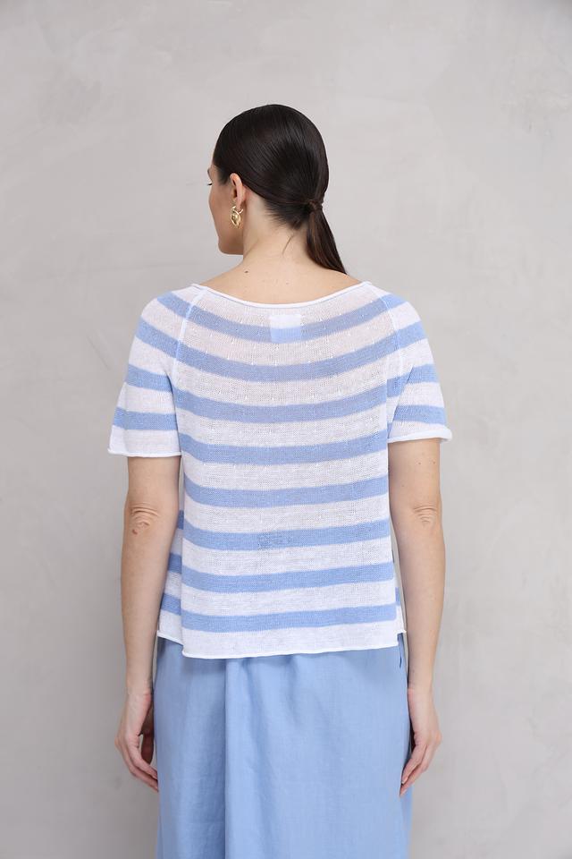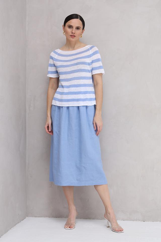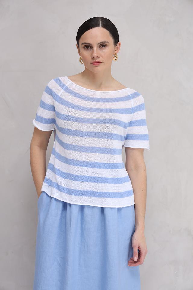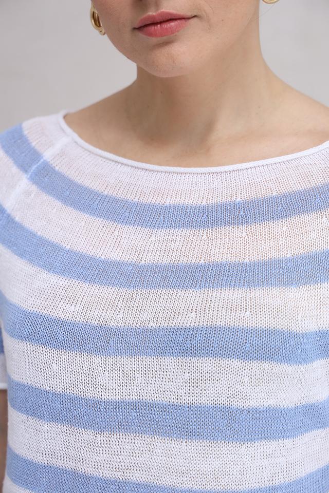 Женская футболка Oui голубого цвета с классическим полосатым принтом. Изготовлена из 100% льна, что обеспечивает комфорт и воздухопроницаемость в жаркую погоду. Стильный и универсальный вариант для создания повседневных образов. Состав: лен 100%