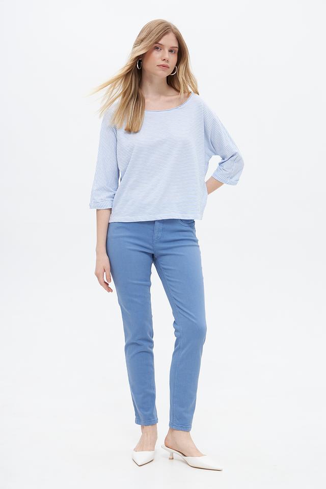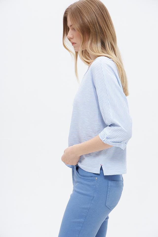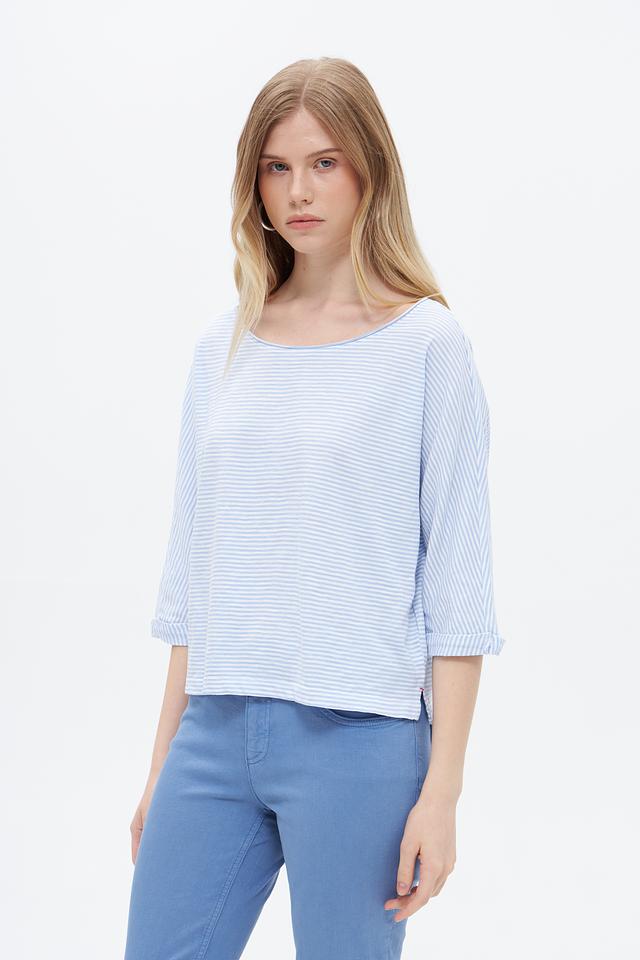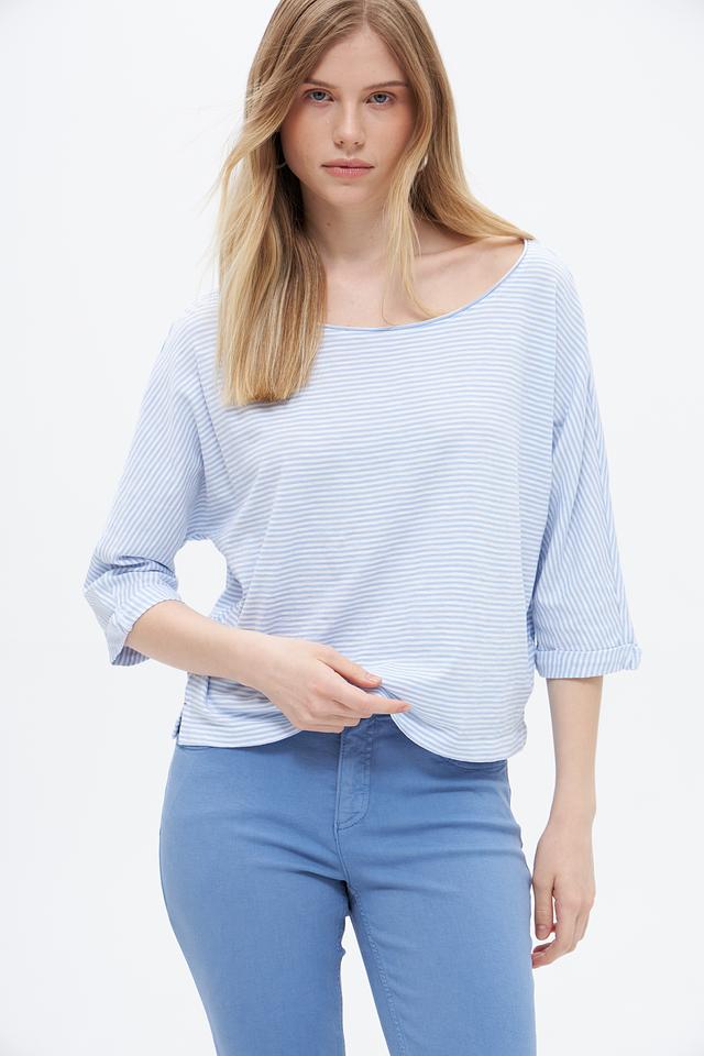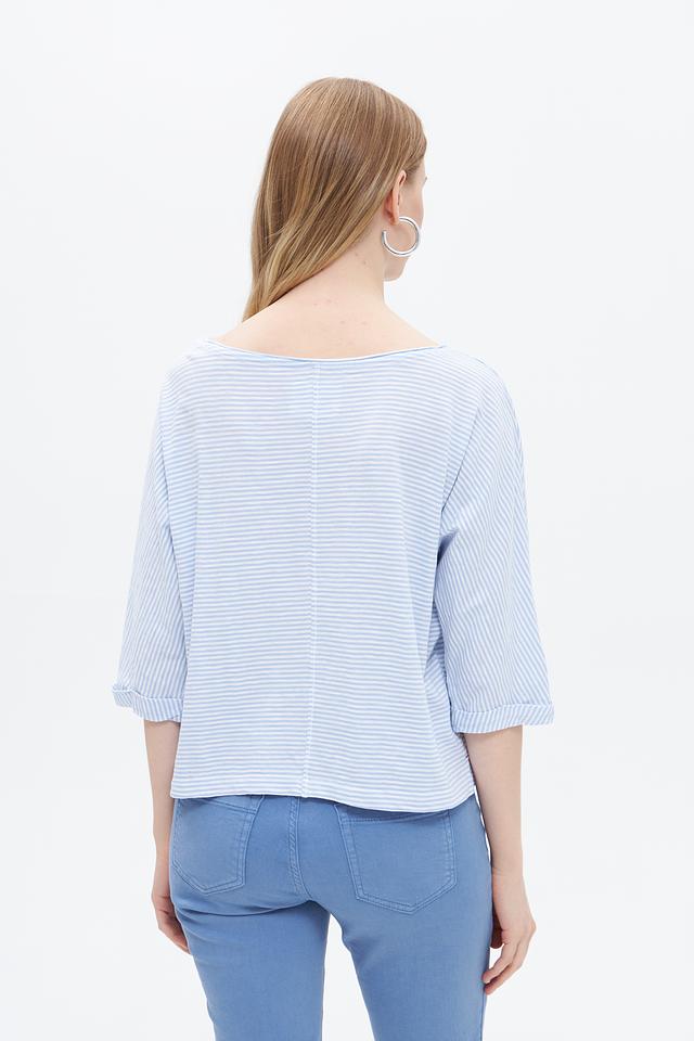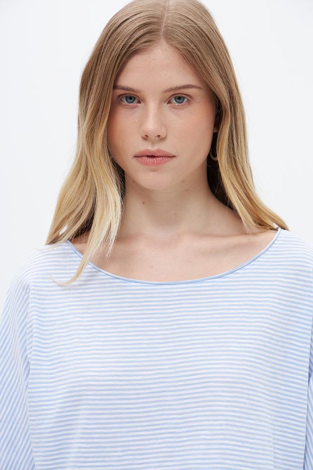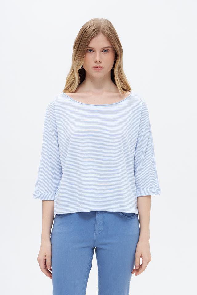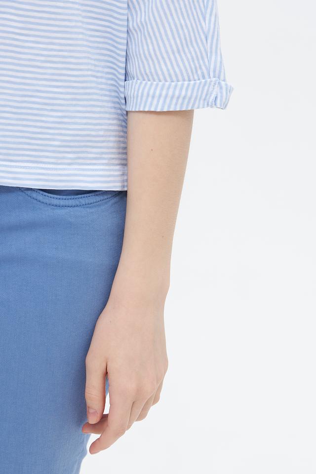 Модель имеет прямой крой, округлый вырез горловины и короткие рукава с манжетами. Футболка выполнена в классическую полоску голубого и белого цветов, что делает ее универсальной и легко сочетаемой с различными элементами одежды.