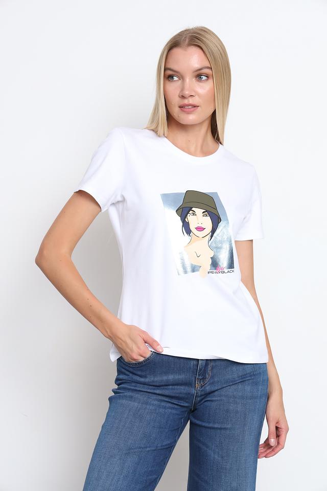 Белая футболка Penny Black с ярким принтом в виде портрета девушки в шляпе. Изготовлена из мягкого хлопка с добавлением эластана для комфорта и лучшей посадки. Состав: хлопок 95%, эластан 5%