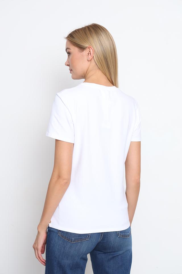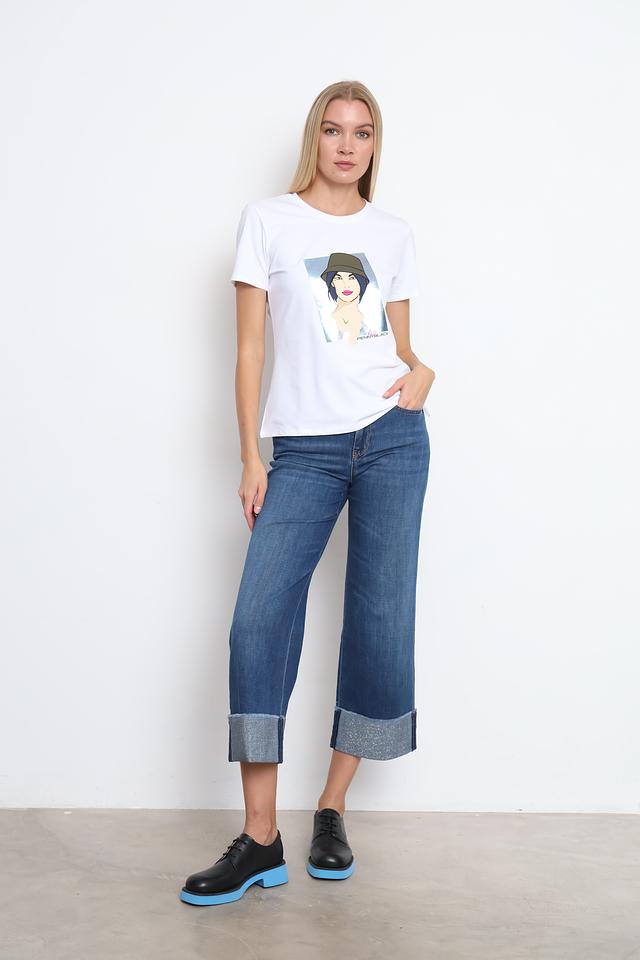 Основной цвет футболки – белый, что делает ее универсальной и легко сочетаемой с другими элементами одежды. Главная особенность модели – яркий принт на лицевой стороне, изображающий портрет девушки в шляпе, выполненный в графичном стиле.