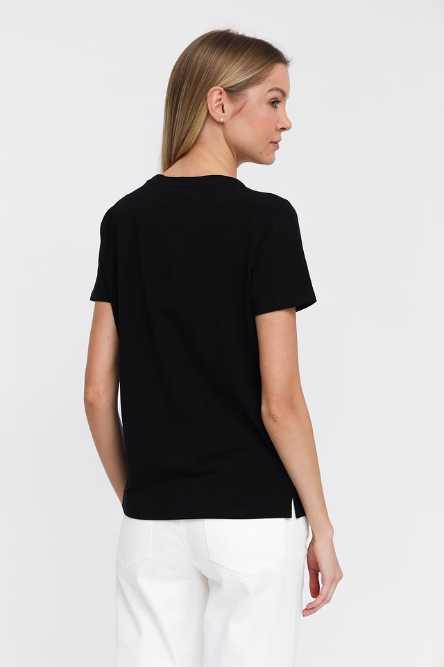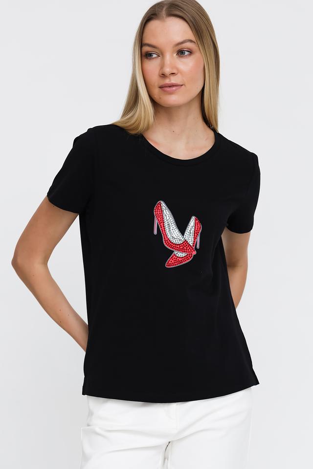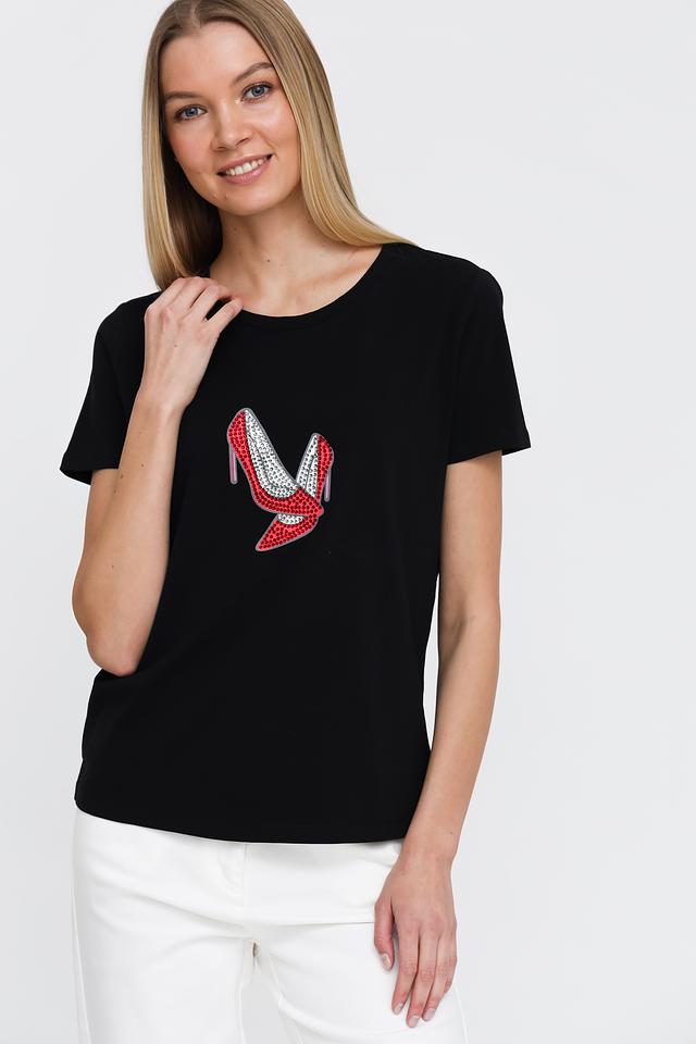 Основной цвет футболки – чёрный, который отлично сочетается с любым низом. Главная особенность модели – эффектный принт в виде красных туфель на каблуке, выполненный с использованием ярких деталей.