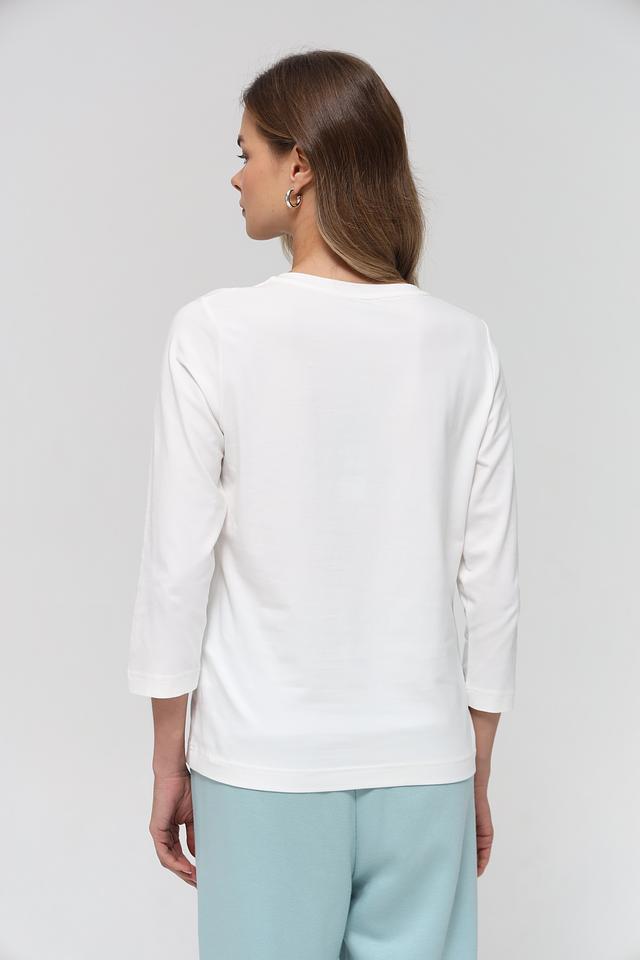 Футболка имеет прямой крой, круглый вырез горловины и короткие рукава 3/4. Изготовлена из высококачественного хлопка с добавлением эластана, что обеспечивает приятные тактильные ощущения и хорошую посадку по фигуре.