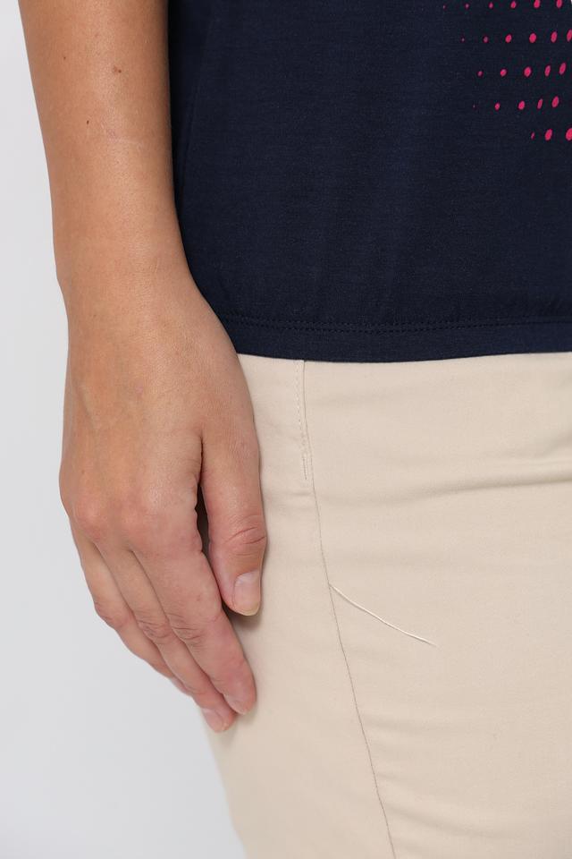 Женская футболка Rabe collection синего цвета с ярким абстрактным принтом. Модель выполнена из мягкого и приятного к телу сочетания хлопка, модала и эластана, обеспечивающего комфорт при носке. Состав: хлопок 47%, модал 47%, эластан 6%