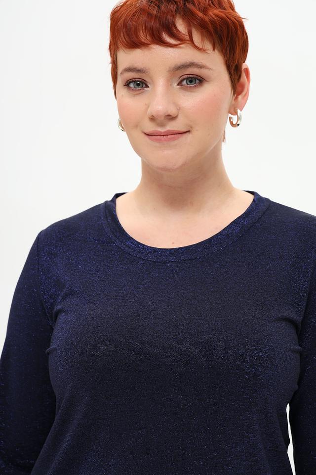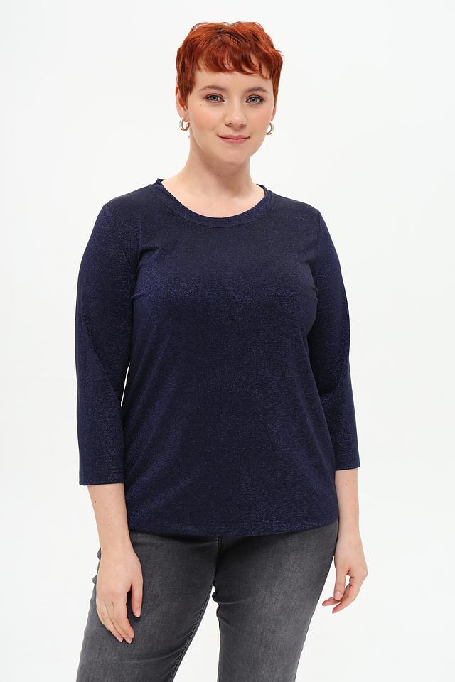 Основной цвет футболки – темно-синий, но ткань имеет деликатный блеск, который придает ей нарядный вид. Фасон футболки – прямой, с округлым вырезом горловины и рукавами длиной три четверти. Такой крой подходит для разных типов фигур и позволяет создавать разнообразные образы.