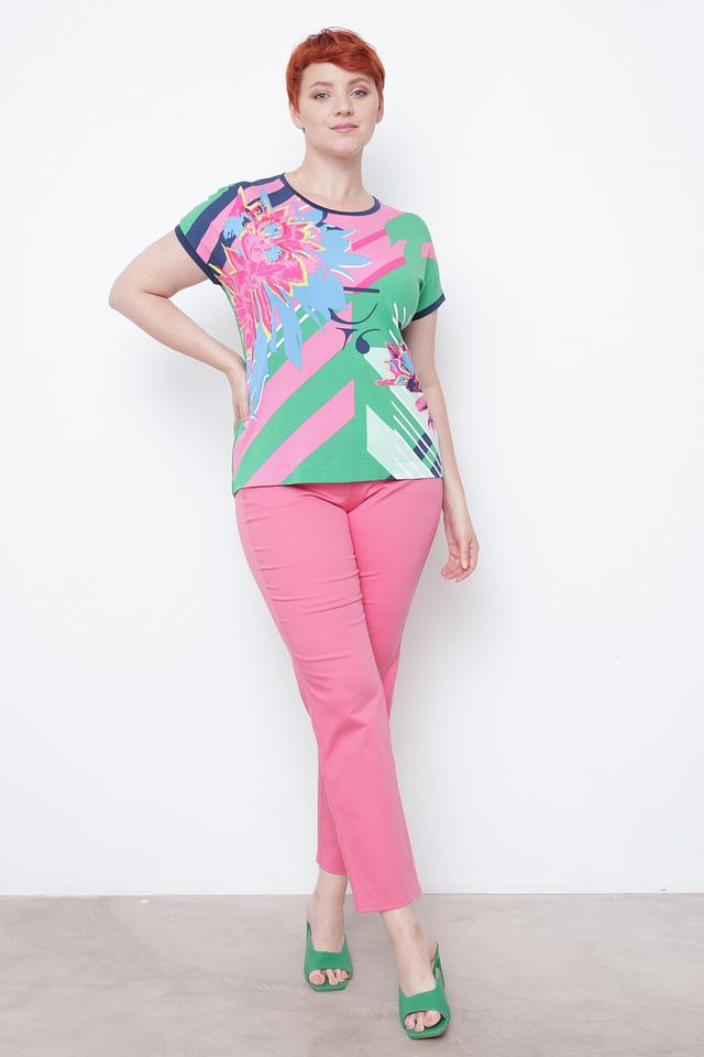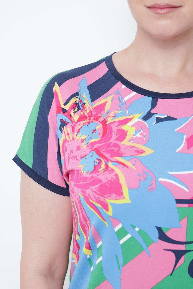 Футболка имеет прямой крой и короткие рукава, что делает ее универсальной для различных типов фигур. Главная особенность модели – эффектный цветочный принт, выполненный в ярких и сочных оттенках. Окантовка горловины и рукавов выполнена в темно-синем цвете, что добавляет контрастности и завершенности образу.