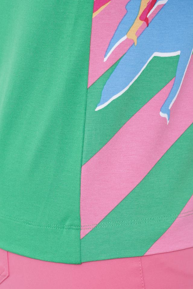 Женская футболка Rabe collection зеленого цвета с ярким цветочным принтом. Модель выполнена из мягкой вискозы с добавлением эластана для комфорта и хорошей посадки. Идеальный выбор для создания стильного и легкого образа. Состав: вискоза 92%, эластан 8%