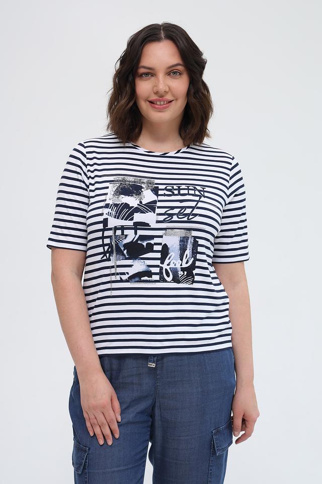 Женская футболка Rabe collection синего и белого цвета с ярким принтом. Модель выполнена из мягкой вискозы с добавлением эластана, обеспечивающего комфортную посадку. Идеальный выбор для создания повседневного образа. Состав: вискоза 92%, эластан 8%