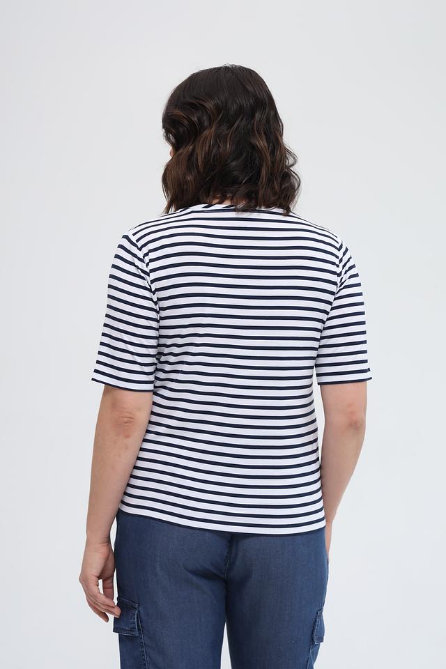 Эта стильная футболка от Rabe collection станет отличным дополнением к вашему гардеробу. Модель выполнена в классическую полоску синего и белого цветов, что делает ее универсальной и легко сочетаемой с другой одеждой.