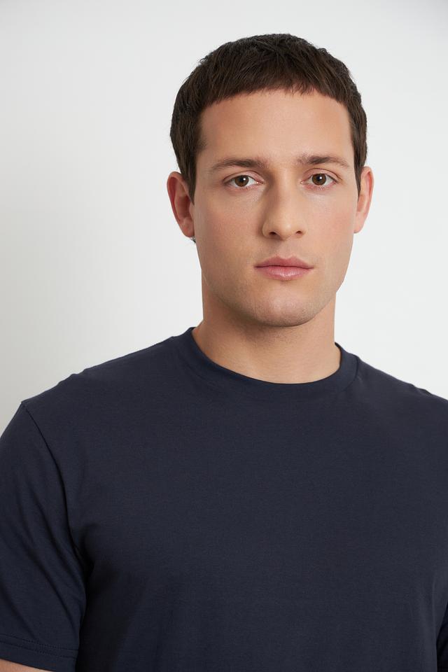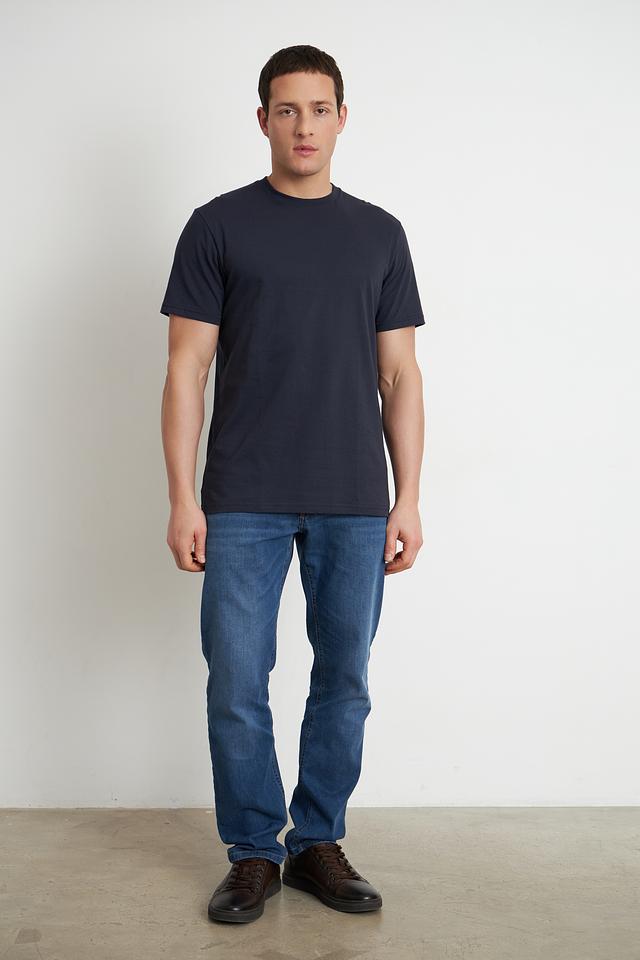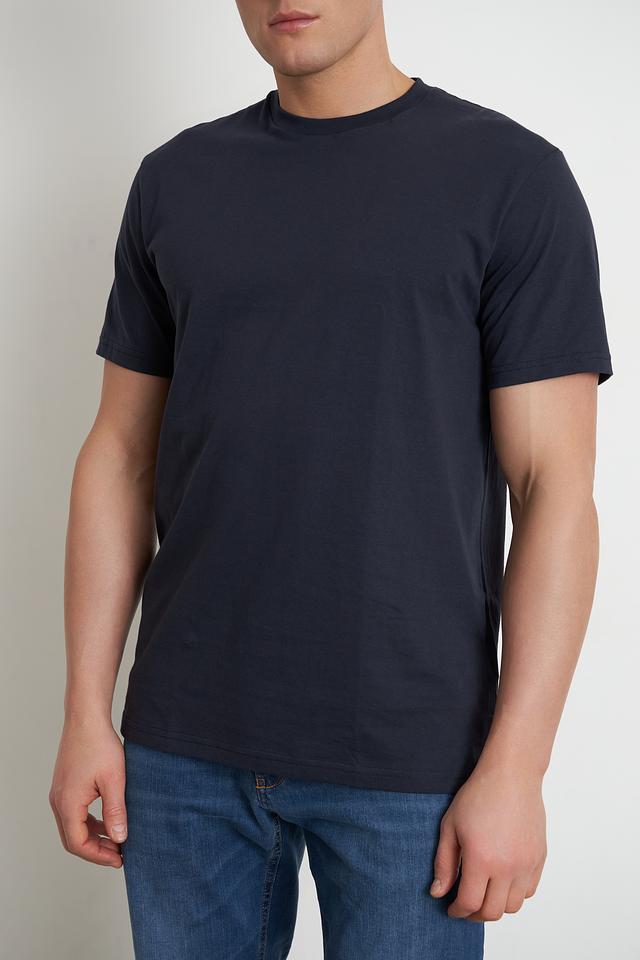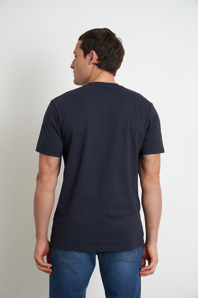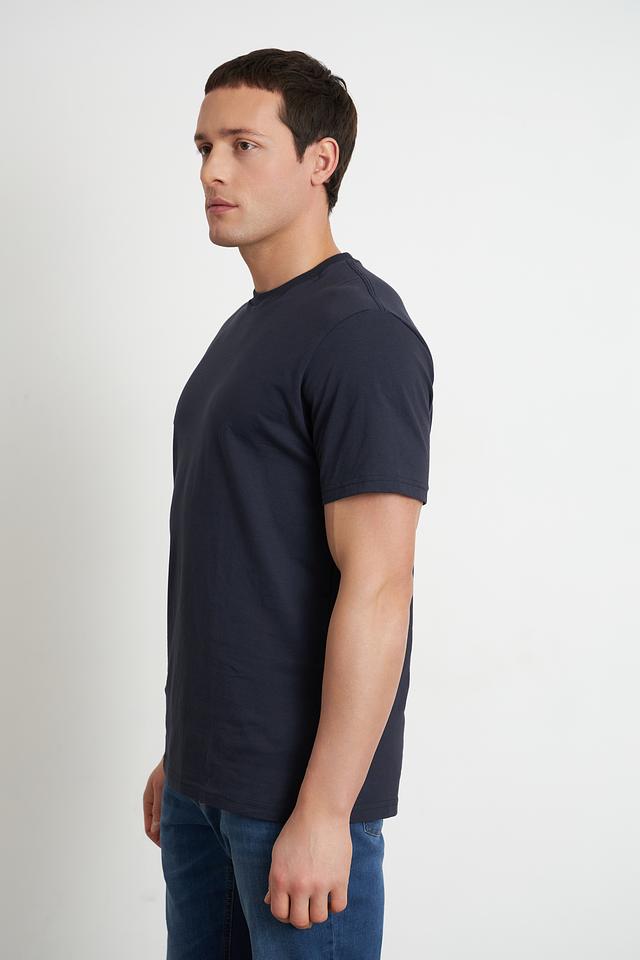 Футболка имеет классический прямой крой, который подходит для любого типа фигуры. Круглый вырез горловины и короткие рукава делают ее идеальным выбором для теплой погоды. Тёмно-синий цвет футболки универсален и легко сочетается с различными элементами одежды.