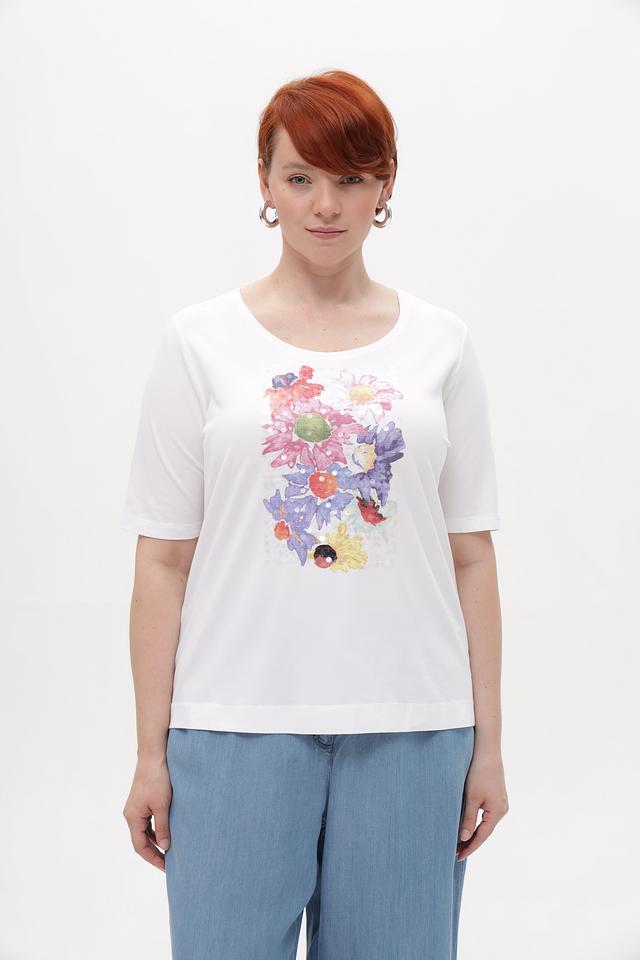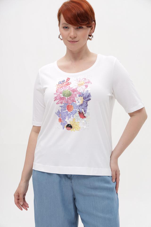Белая футболка Samoon с ярким цветочным принтом и божьей коровкой станет отличным дополнением к вашему летнему гардеробу. Изготовлена из мягкого и приятного к телу модала с добавлением хлопка и эластана. Состав: модал 50%, хлопок 45%, эластан 5%