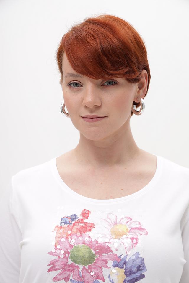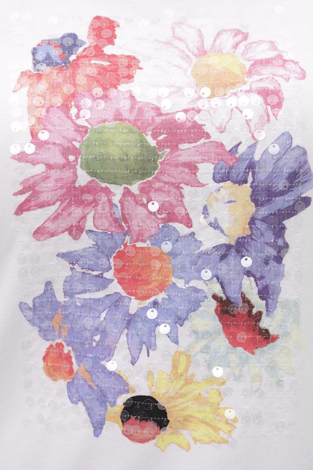Основным элементом дизайна является яркий и красочный цветочный принт, который добавляет образу женственности и свежести. Небольшая деталь – изображение божьей коровки – придает футболке игривость и оригинальность.