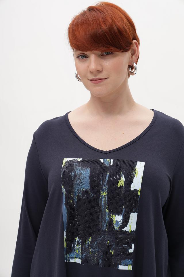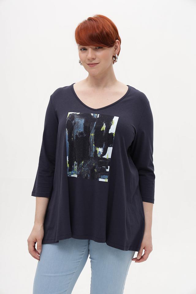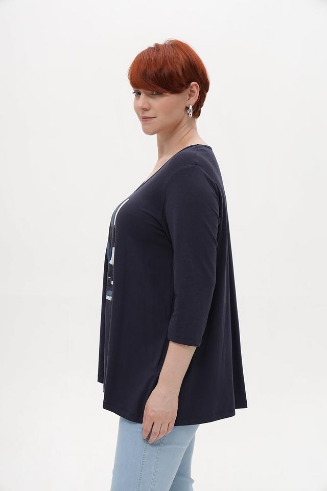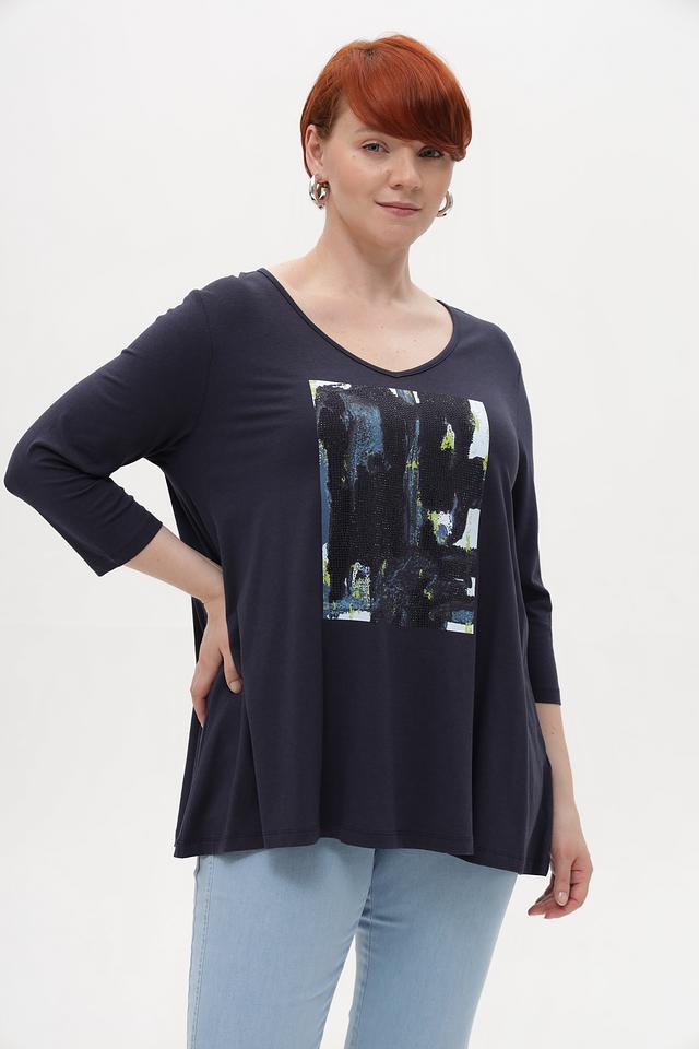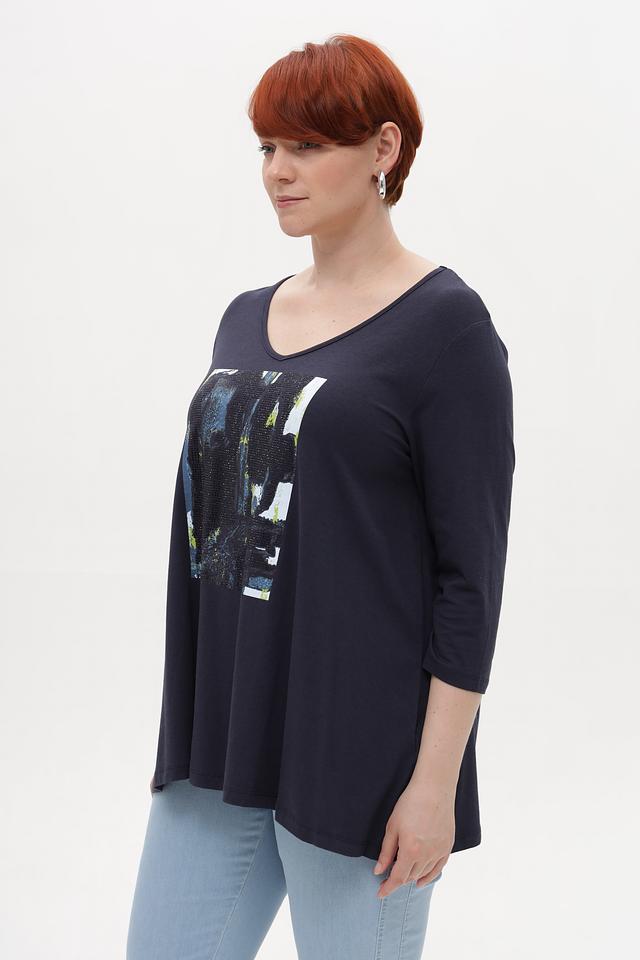 Тёмно-синяя футболка от Samoon с оригинальным принтом. Изготовлена из мягкого модала с добавлением хлопка и эластана для комфорта в носке. Подчеркнёт ваш стиль и индивидуальность. Состав: модал 50%, хлопок 45%, эластан 5%