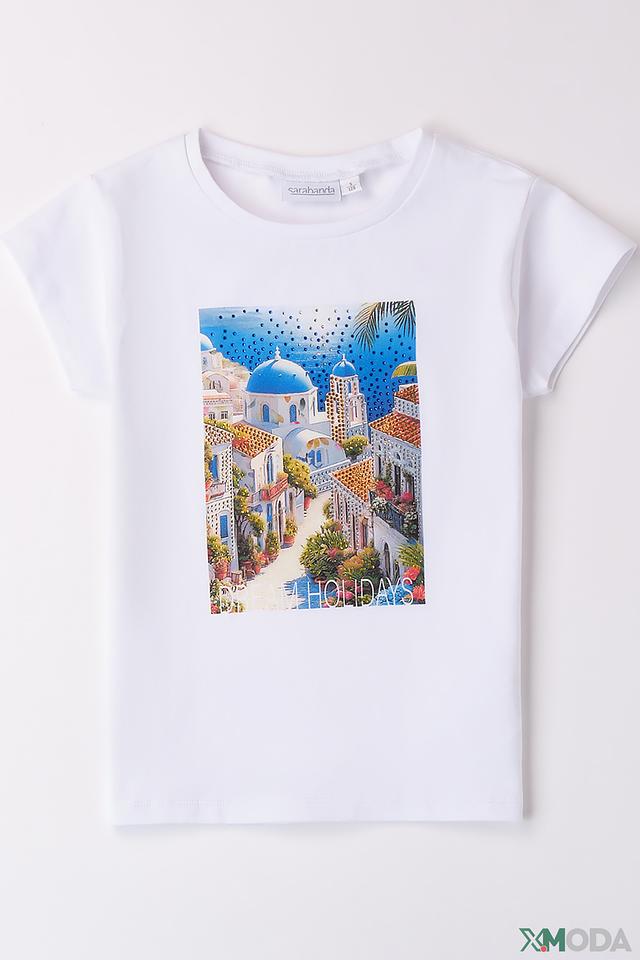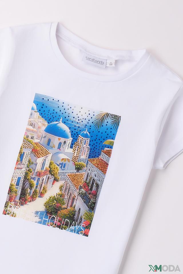 Белая футболка Sarabanda для девочки с ярким принтом в виде городского пейзажа. Изготовлена из мягкого хлопка с добавлением эластана для комфорта и свободы движений. Состав: хлопок 95%, эластан 5%