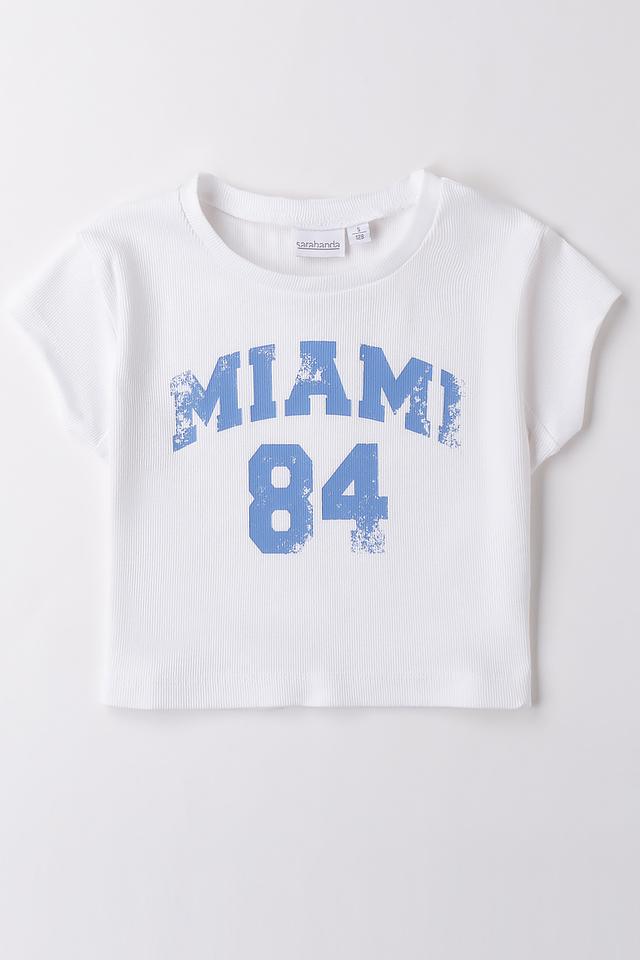 Белая футболка Sarabanda для девочки с ярким принтом "Miami". Изготовлена из мягкого хлопка с добавлением эластана для комфорта и свободы движений. Отличный выбор для повседневной носки. Состав: хлопок 95%, эластан 5%