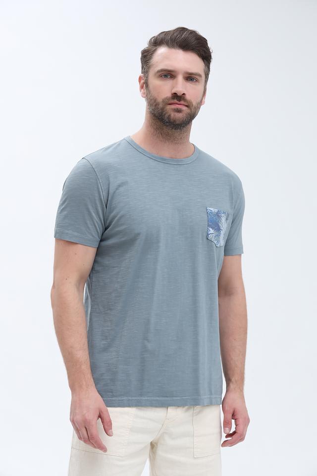 Особенностью данной модели является накладной карман на груди, украшенный ярким принтом с изображением тропических листьев и волн. Этот элемент придает футболке оригинальный и стильный вид.