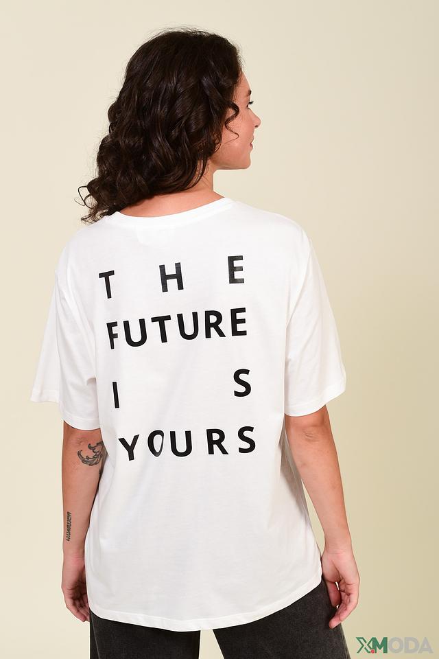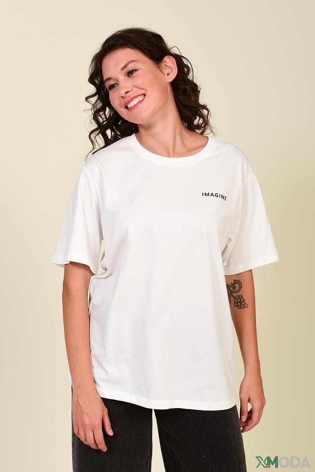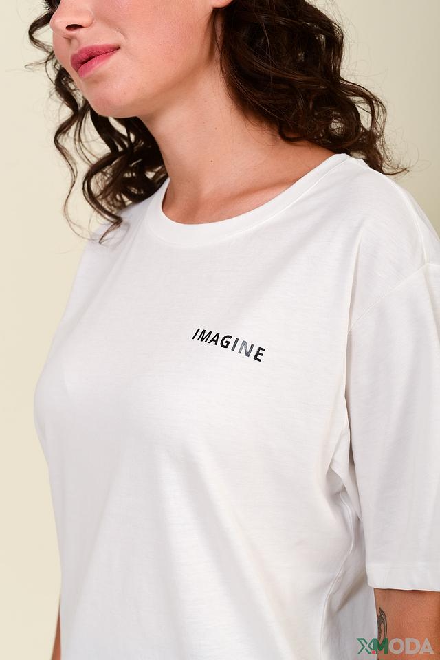 Модель имеет свободный крой, который не сковывает движений и позволяет создать расслабленный силуэт. Передняя часть футболки украшена надписью "IMAGINE", а задняя – надписью "THE FUTURE IS YOURS", что придает ей индивидуальность и стиль.